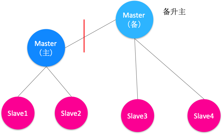 以Master节点主备部署为例,如下图所示,集中式架构中的网络分区主要是主节点与备节点之间网络不通,且一部分Slave节点只能与主Master节点连通,另一部分只能与备Master节点连通。
