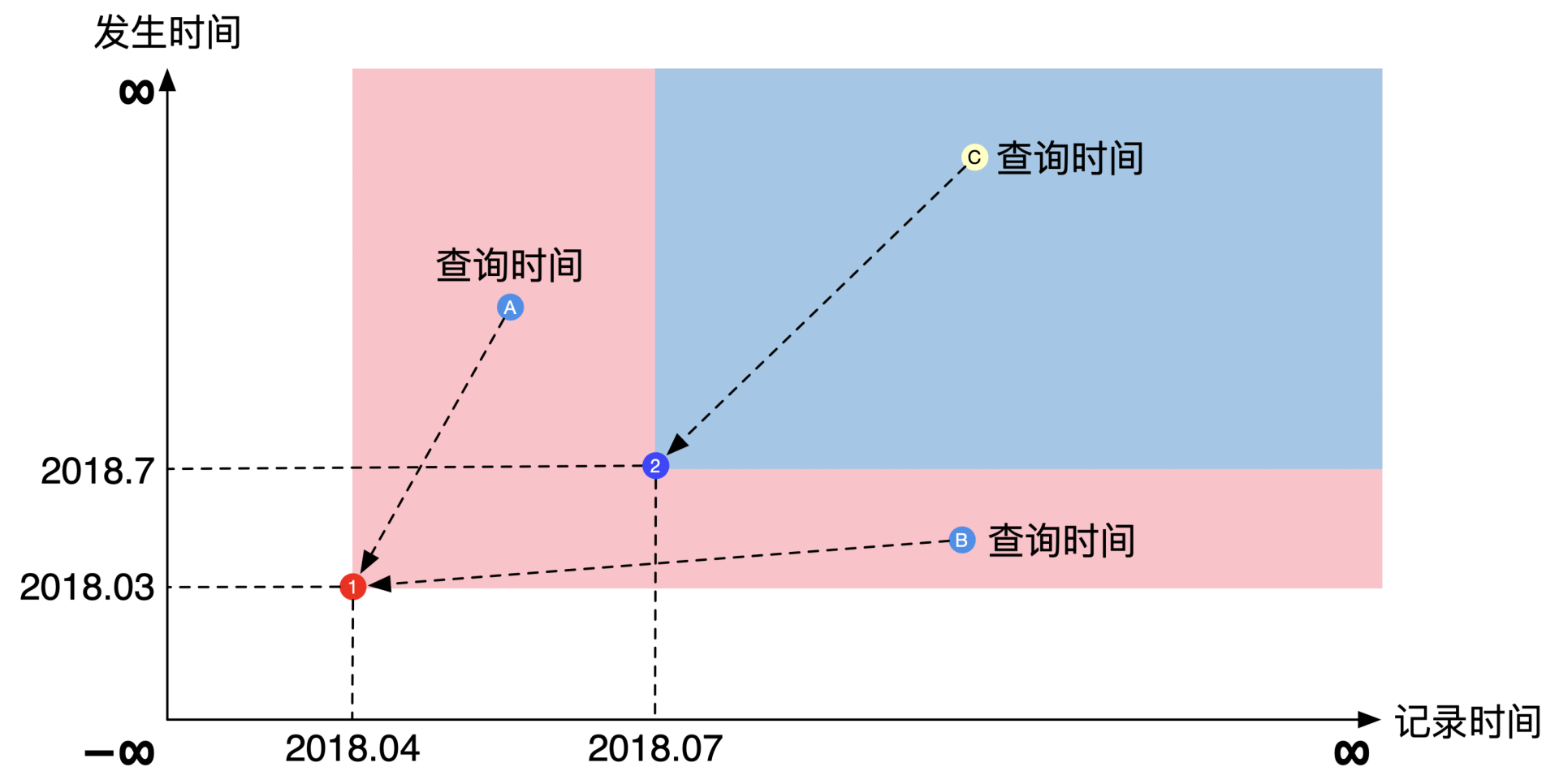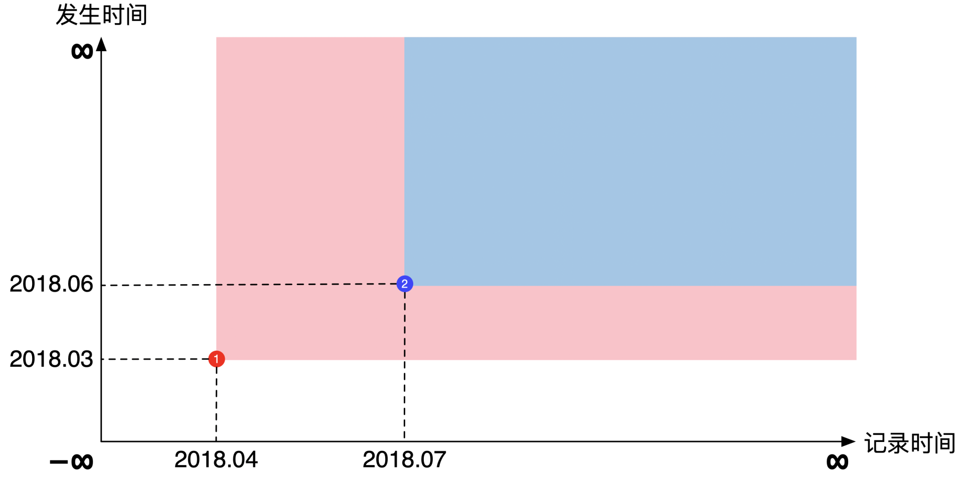 按照行业惯例,横轴是记录时间,纵轴是发生时间。理论上每个轴都指向正负无穷远,但是在实际展示中通常将坐标原点表示为负无穷远,主要是为了画起来好看。示意图如下: