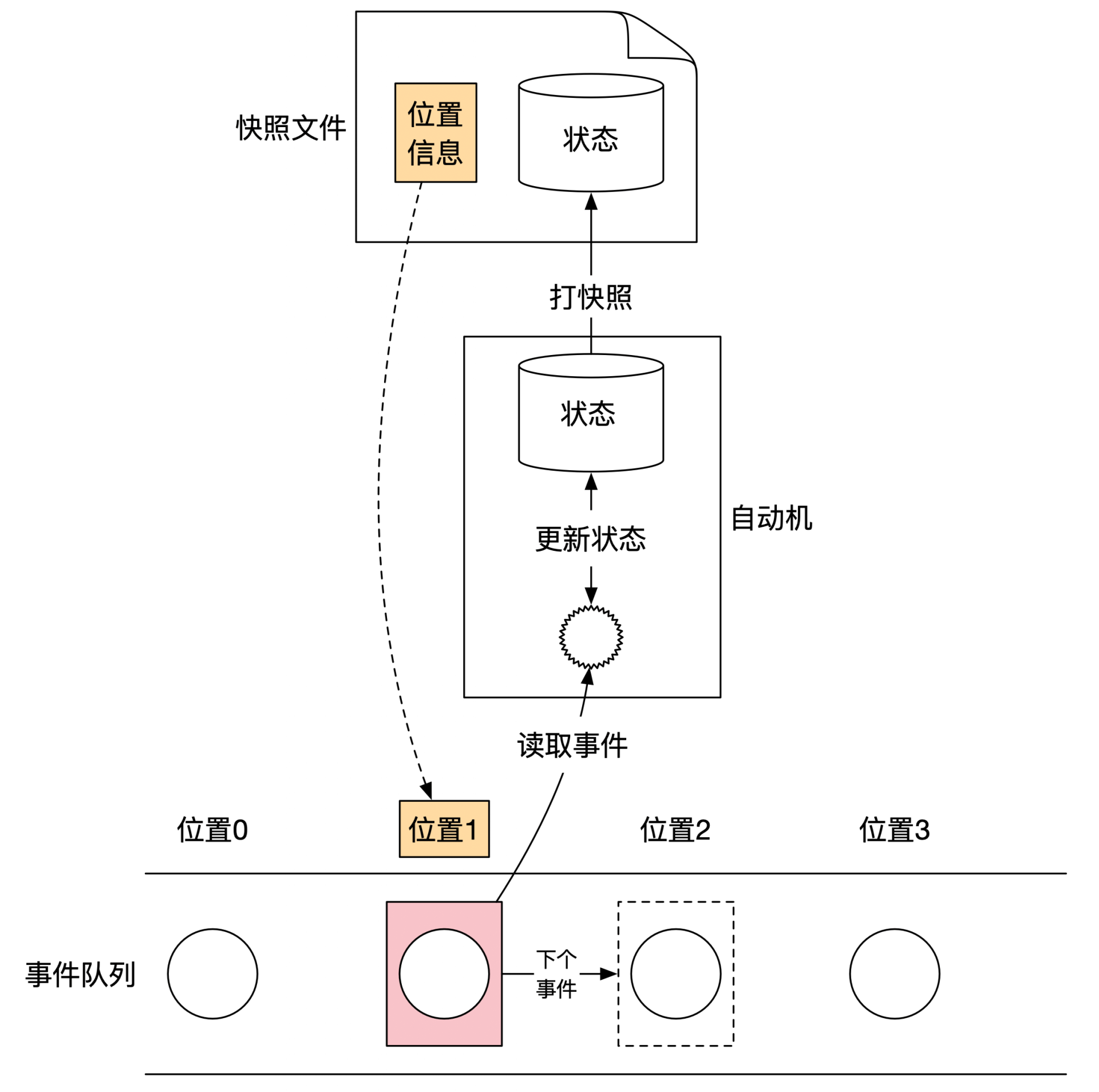 为了能让自动机找到下一个需要执行的事件,你需要将快照对应的事件位置也记录到快照里。打快照的示意图如下: