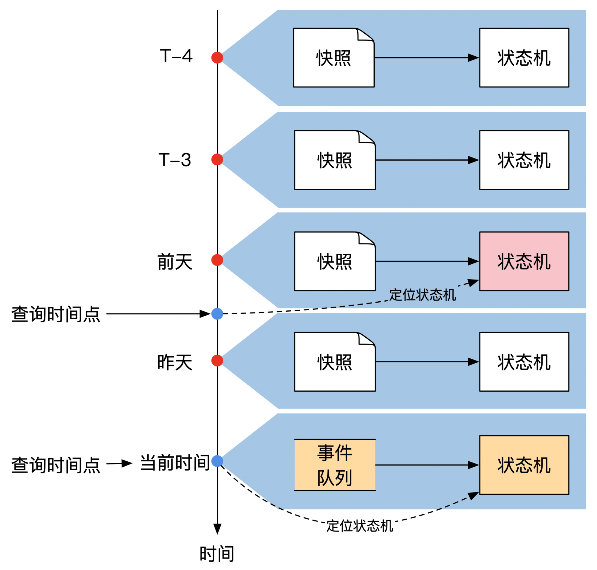 我们再来看看怎么查询历史状态。最直接的方案显然是利用时光机的功能。我们先找到距离查询时间最近的快照,然后从这个快照开始执行事件,直到碰到查询时间点。这时候的状态就是我们需要的状态。一般我们把这个重新计算历史状态的过程叫作回滚