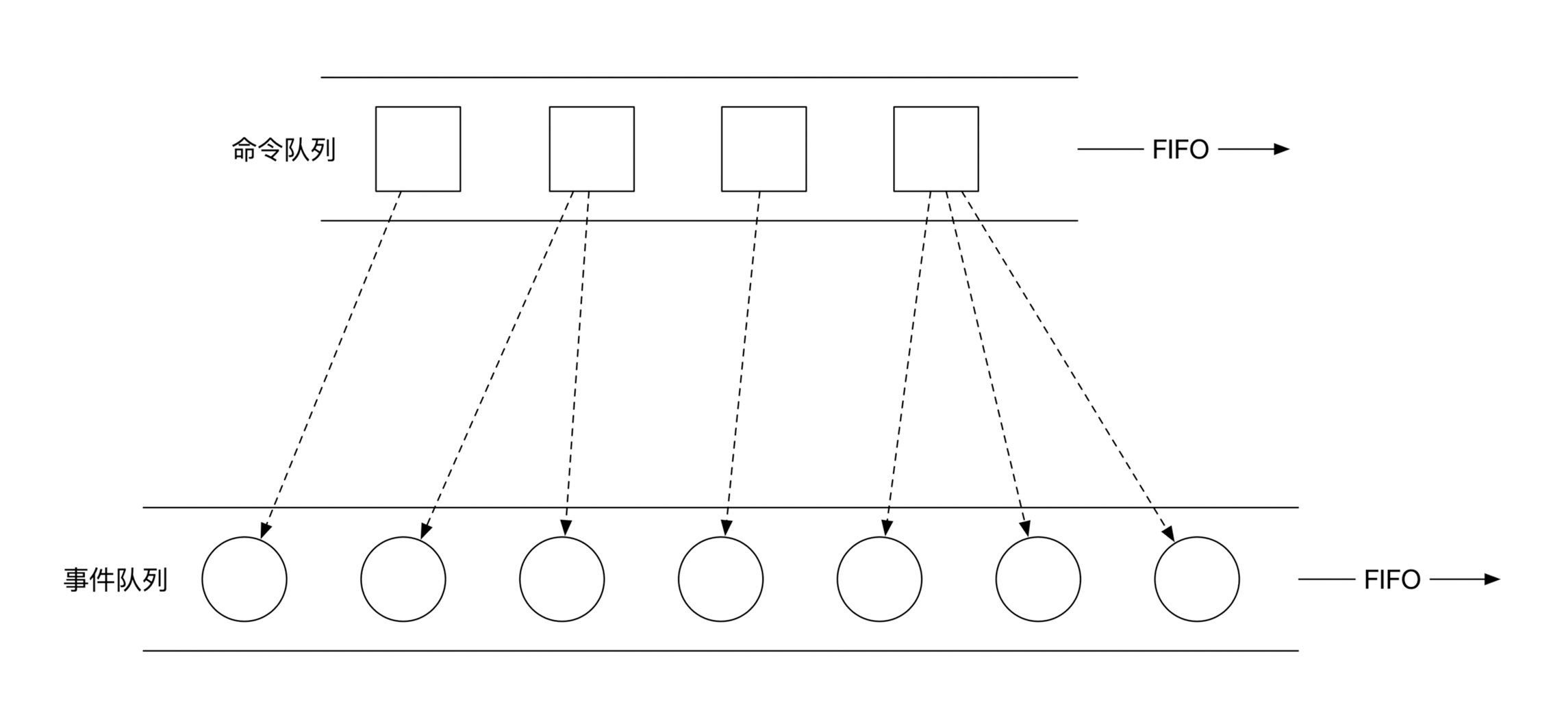 保证顺序的方法也不难,就是将所有的命令和事件都分别放到两个先入先出的队列(First In,First Out,FIFO)。一般这些队列会被保存到文件中。系统会从命令队列中逐一读取下一个命令,判断这个命令是否合理,然后将生成的所有事件放到事件队列末尾。示意图如下: