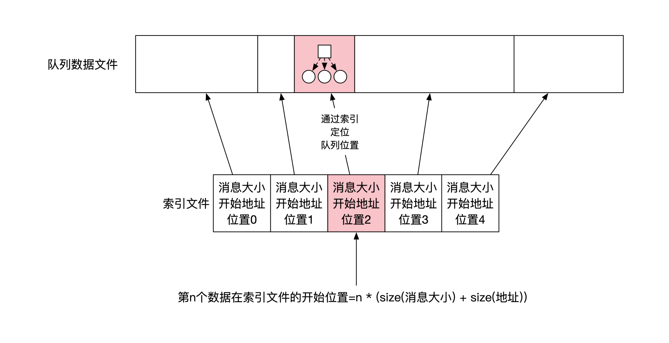 由于位置信息和偏移量这两个数据的长度都是固定的,索引文件的每个内容都有固定大小,所以我们可以根据我们要的位置直接计算出索引文件的偏移量,然后根据索引文件找到队列文件的位置。计算的示意图如下: