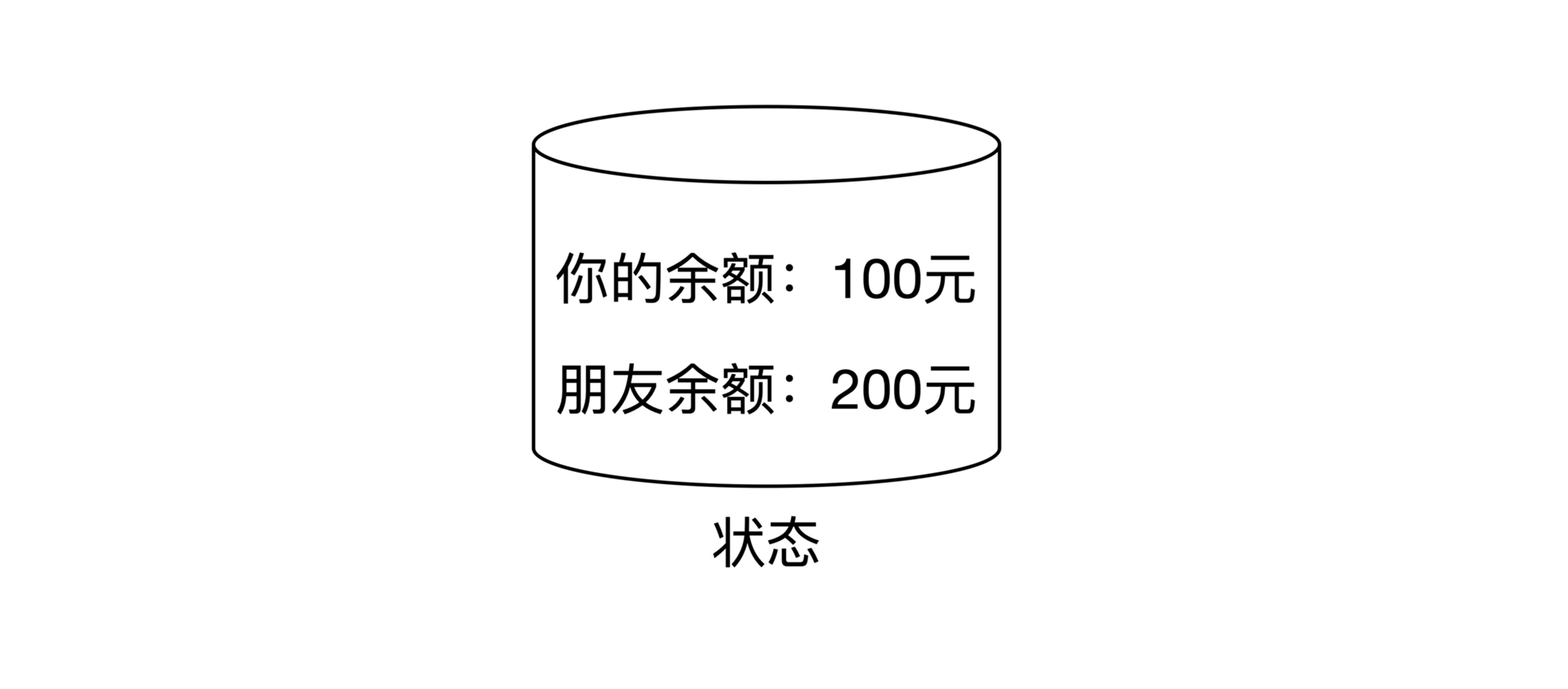 账务系统负责记账,所以它管理着所有用户的账户金额信息,比如说你的现金余额、贷款等等。这些账户金额信息就属于状态。假设你现在账户余额有100元,你朋友的账户余额有200元,你们俩的金额状态示意图如下: