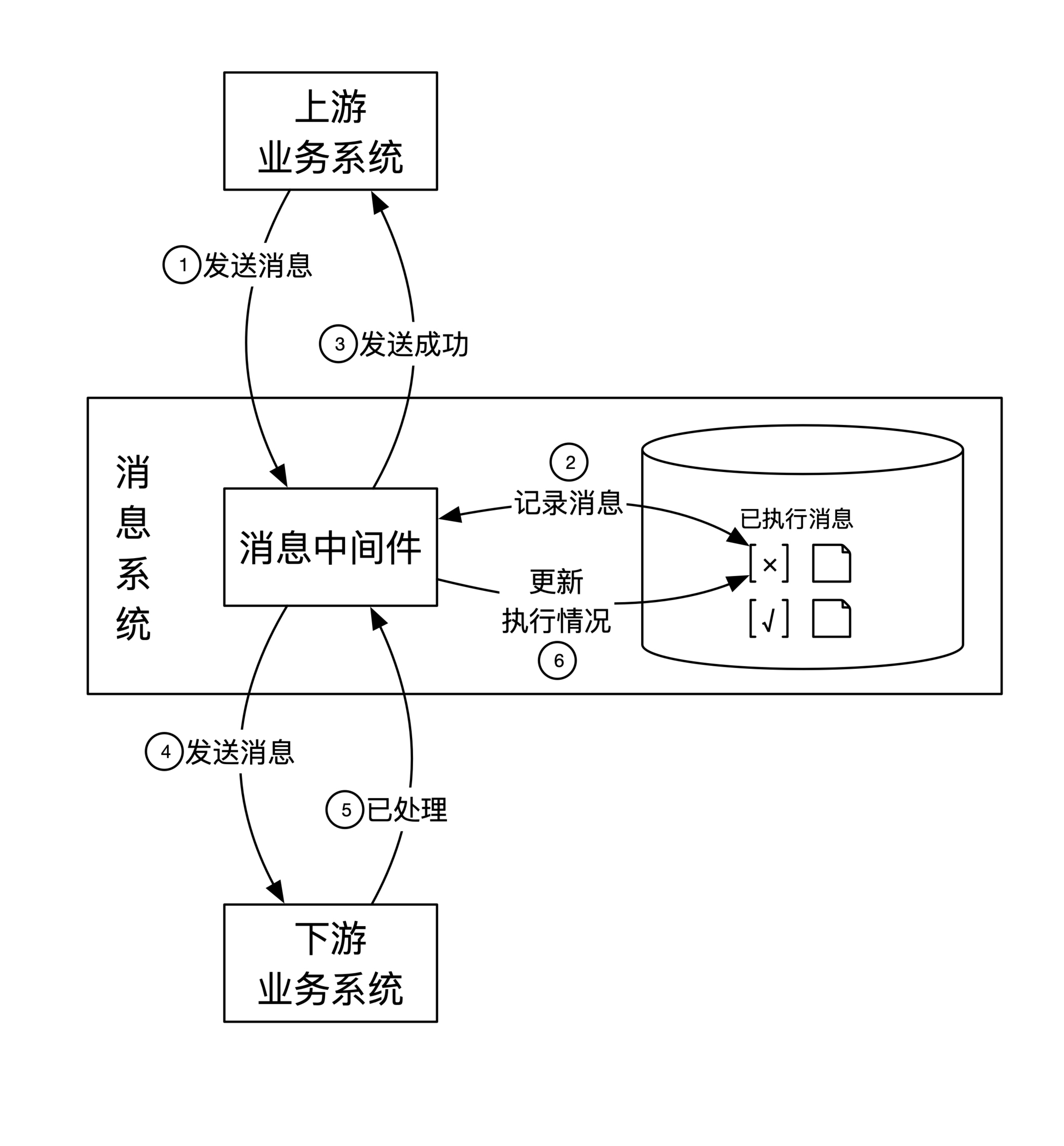 4.消息中间件将消息传给下游的业务系统进行处理。此时消息中间件要处理以下几种情况:如果消息中间件没有收到下游业务系统已执行完的通知,需要持续发送消息给下游业务系统;如果系统重启,中间件要从数据库中找到所有未执行的消息,然后按正确的顺序发给下游业务系统。