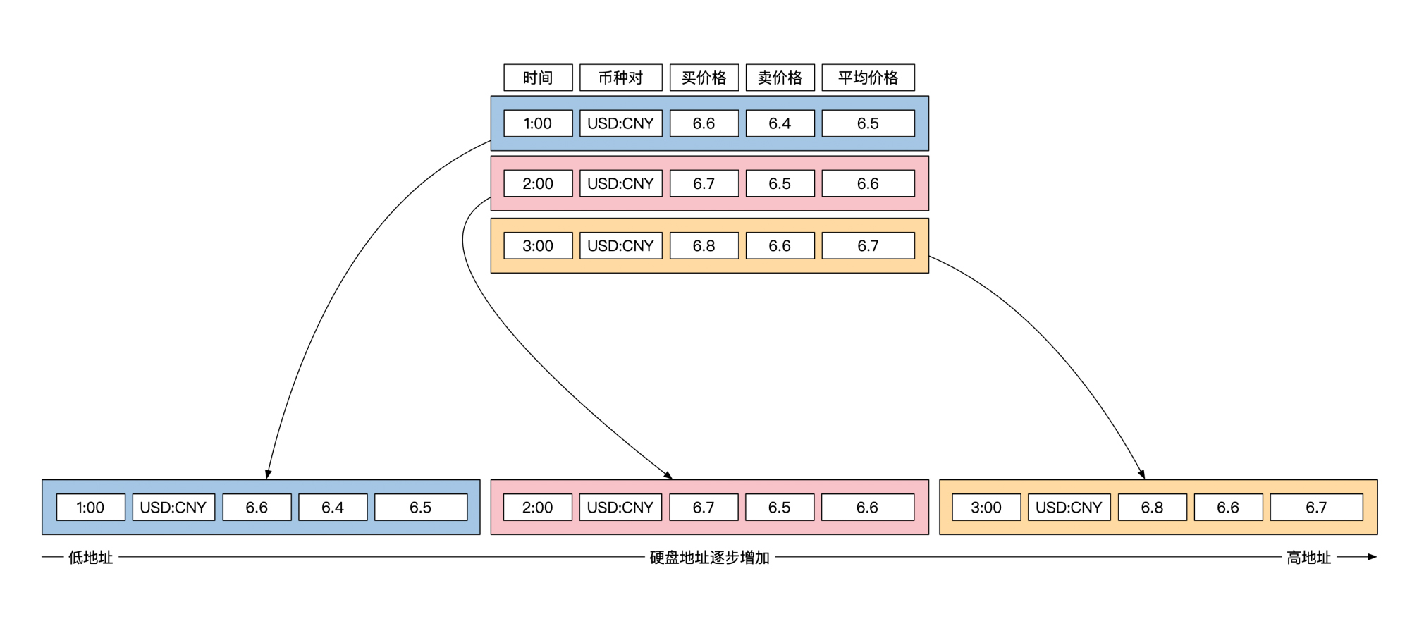 举个例子。假设你要存储外汇信息,那至少需要处理这些数据:时间、汇率币种、买价格、卖价格和平均价格。下面这幅图展示了连续3个时间点的外汇信息: