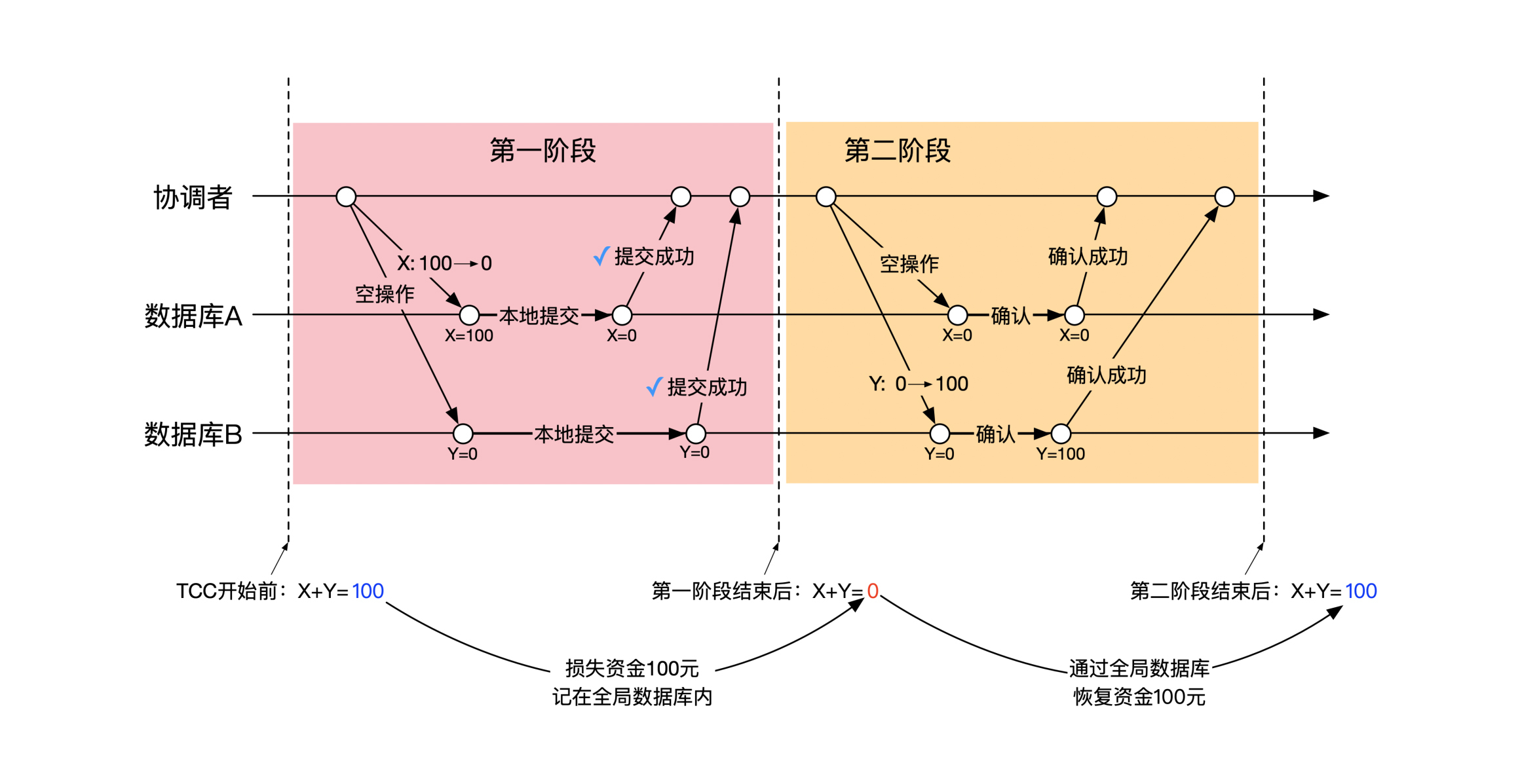 细心的你也许已经发现了,在TCC第一阶段结束后, x 和 y 账号的钱都为0,因此在这一瞬间整个系统掉了100元钱。不过不用担心,因为在协调者的全局事务数据库里记录了当前TCC的状态,之后会在第二阶段把缺失的100元钱再补回来。