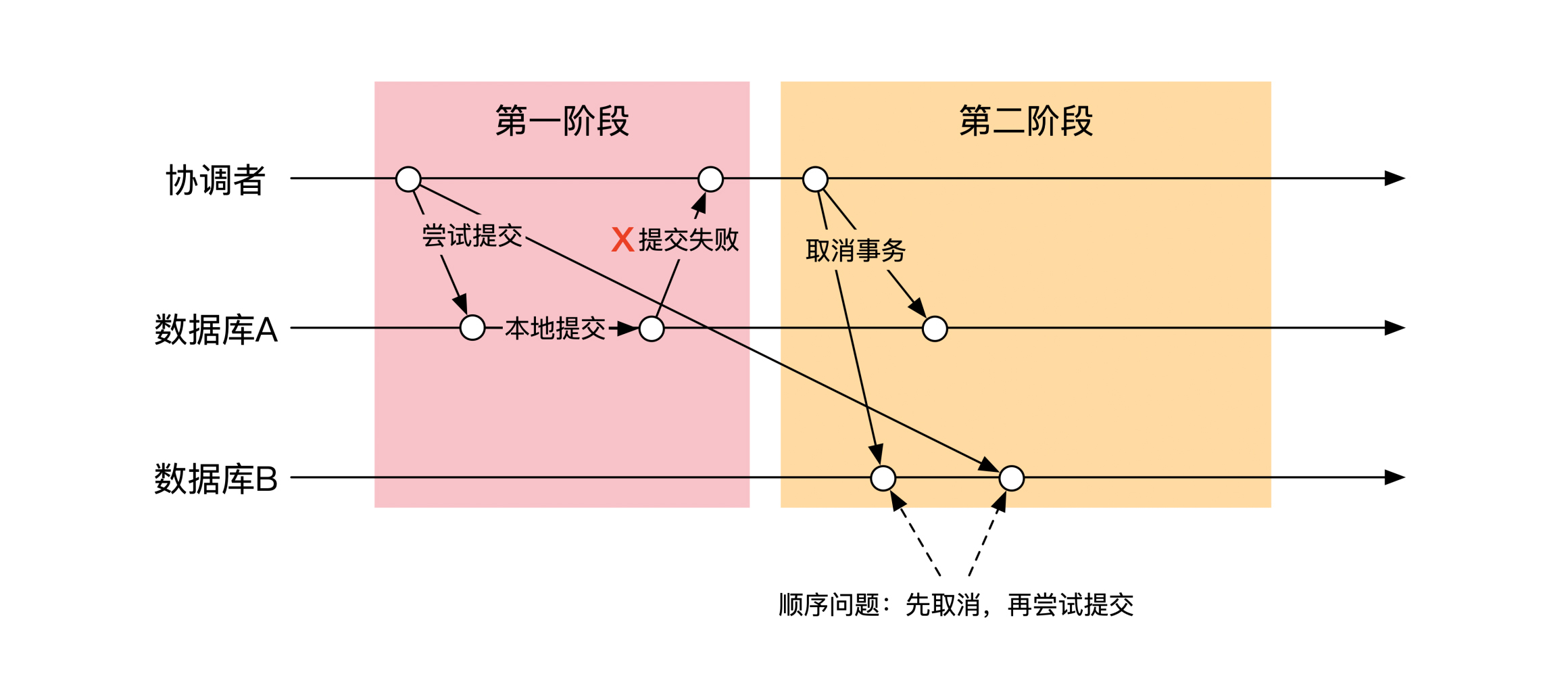因为分布式环境下网络不稳定,第一阶段的消息可能很久以后才会发到一个节点,但是这时候这个节点可能早就收到了协调者第二阶段的消息。就像下面这幅图展示的一样,一个节点可能会先收到第二阶段取消的消息,然后才收到第一阶段尝试提交的消息: