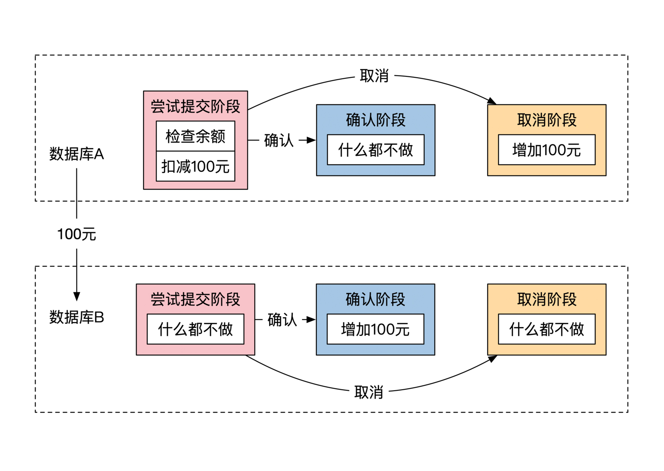 假设和前面一样,一个用户 x 的账户开始有100元钱,账户信息存储在数据库 A 中。另一个用户 y 的账户里最开始没钱,账户信息存储在数据库 B 中。然后系统发起了一笔从 x 到 y 的转账,金额为100元。所以转账后 x 的余额为0,而 y 的余额为100。