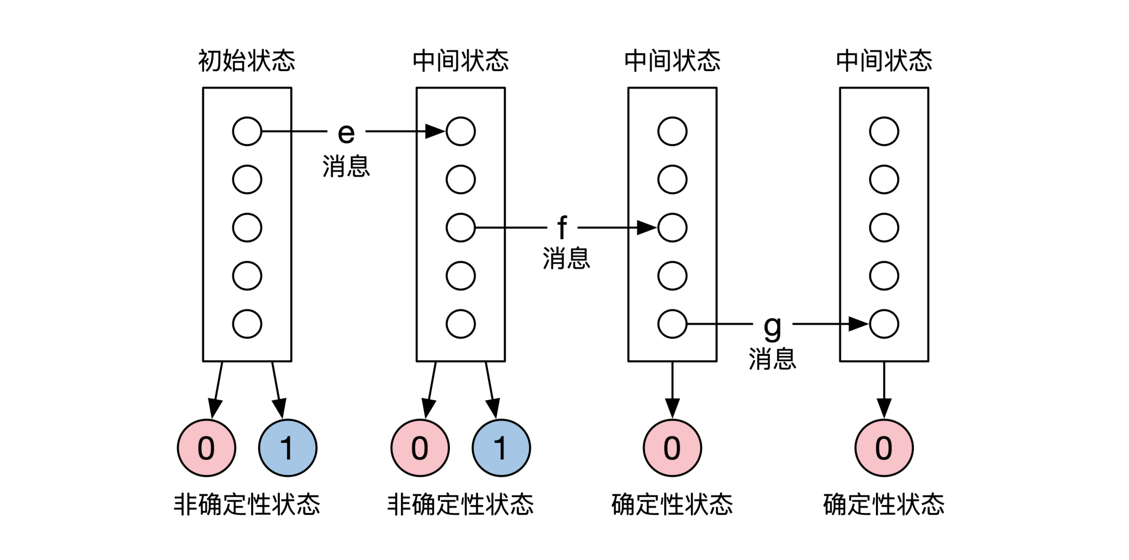 通俗地说,每台机器里面最开始含有一个数字,0或者1。机器最后会输出一个数字,也是0或者1。机器之间可以互相发送消息,通过消息来改变彼此内部的状态。输入和输出示意图如下: