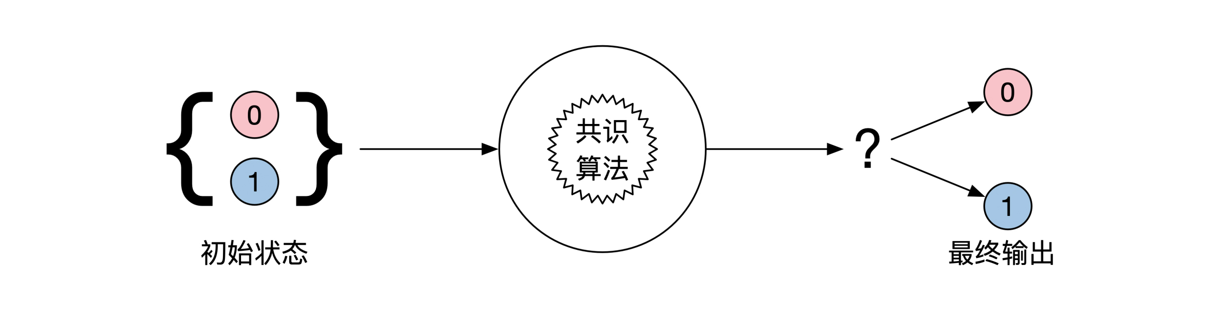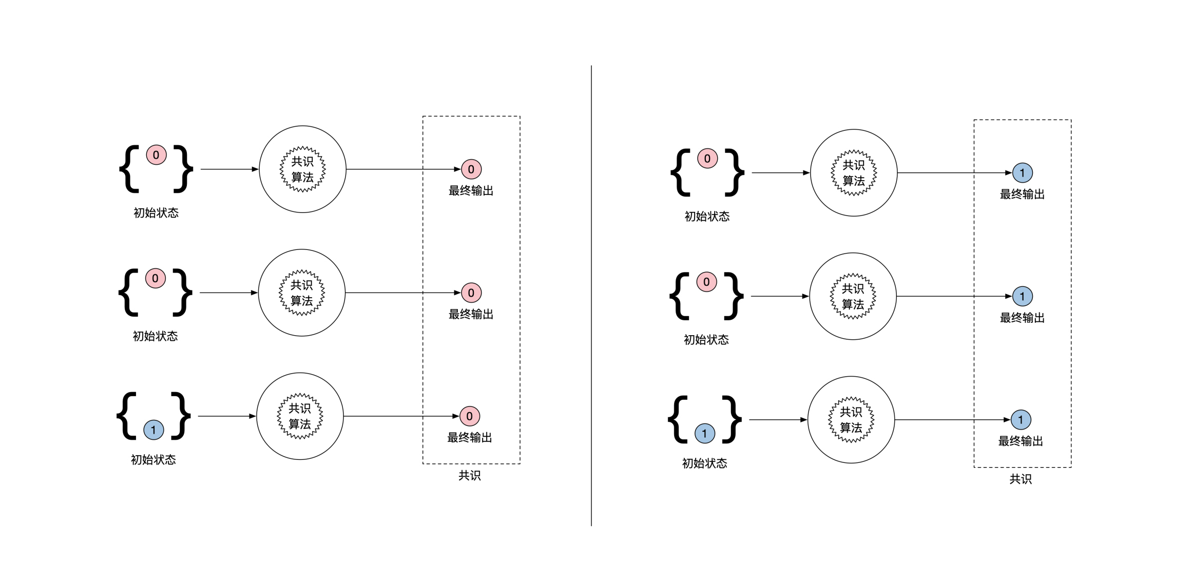 一致性相对好理解一点。一致指所有结果都需要完全相同。终止性和一致性有一个更通俗的解释:所有机器的状态初始可以在0和1中任意选择,最后当共识算法结束的时候,所有还活着的机器需要输出一样的结果,要么都是0,要么都是1。示意图如下:-