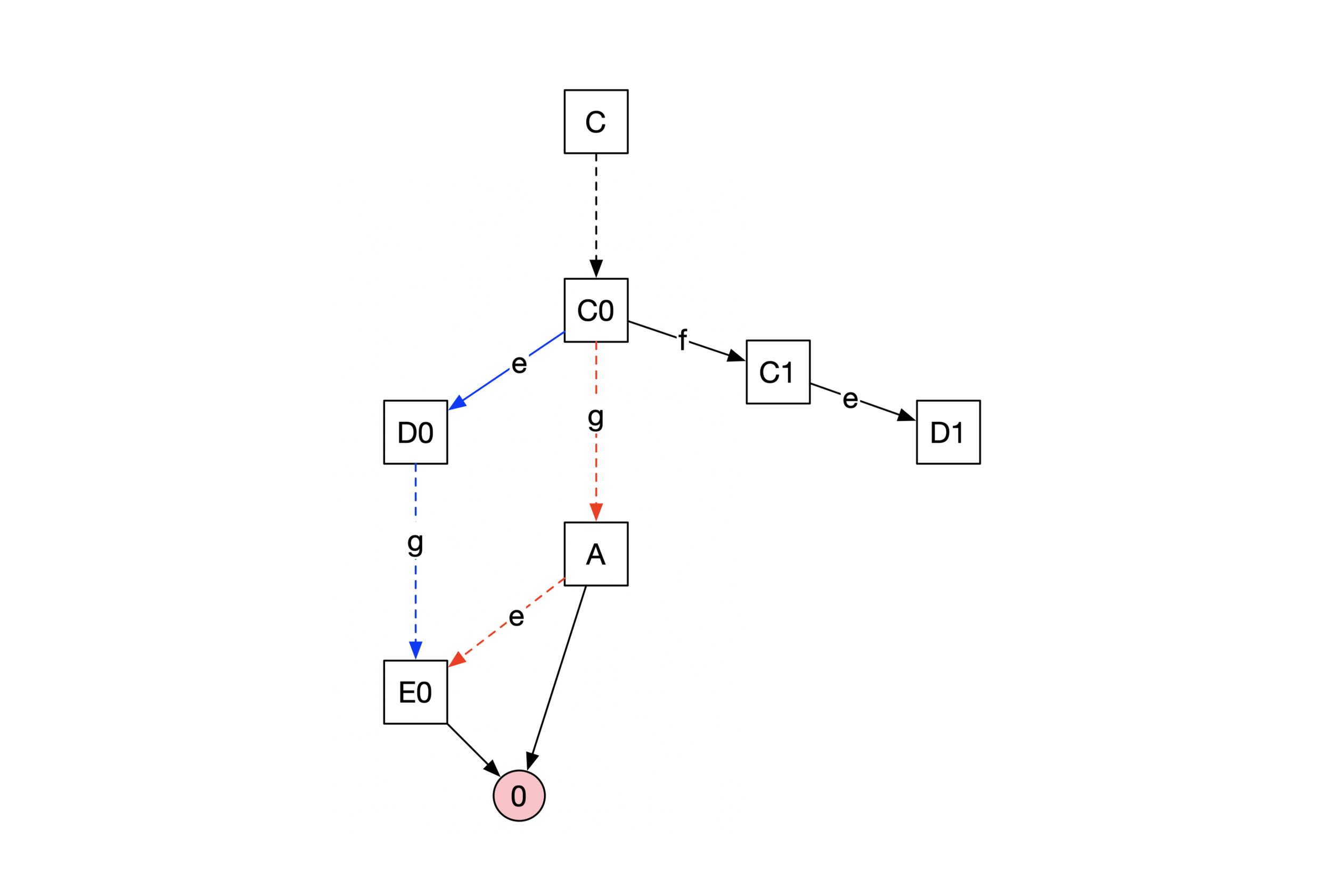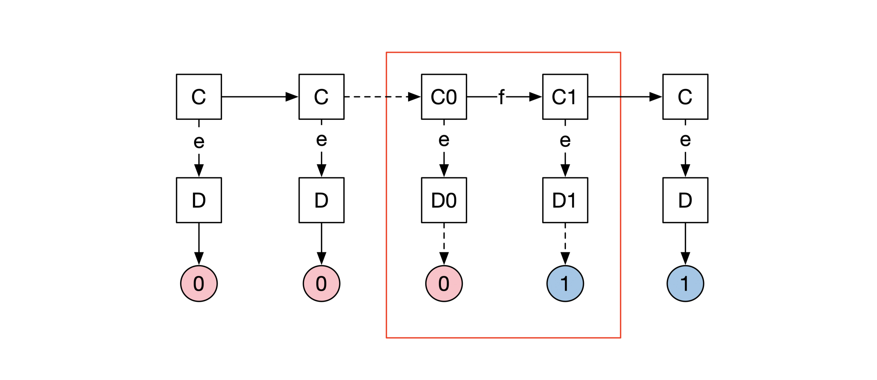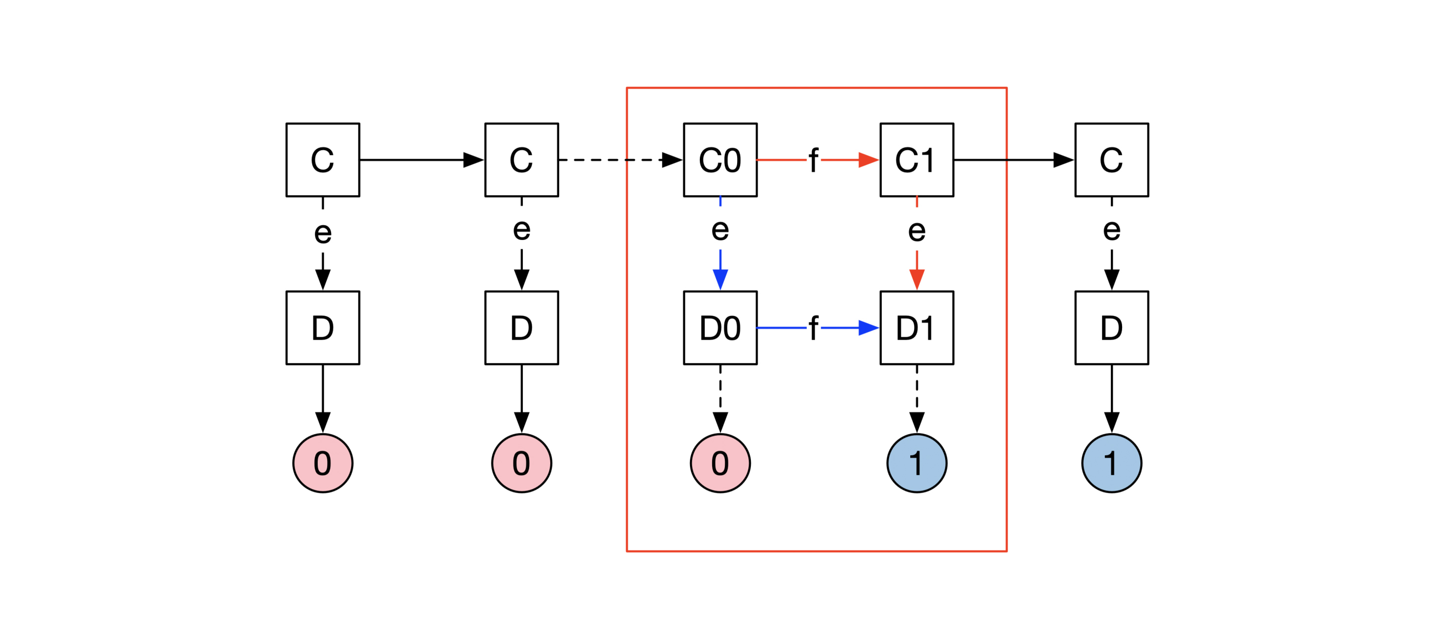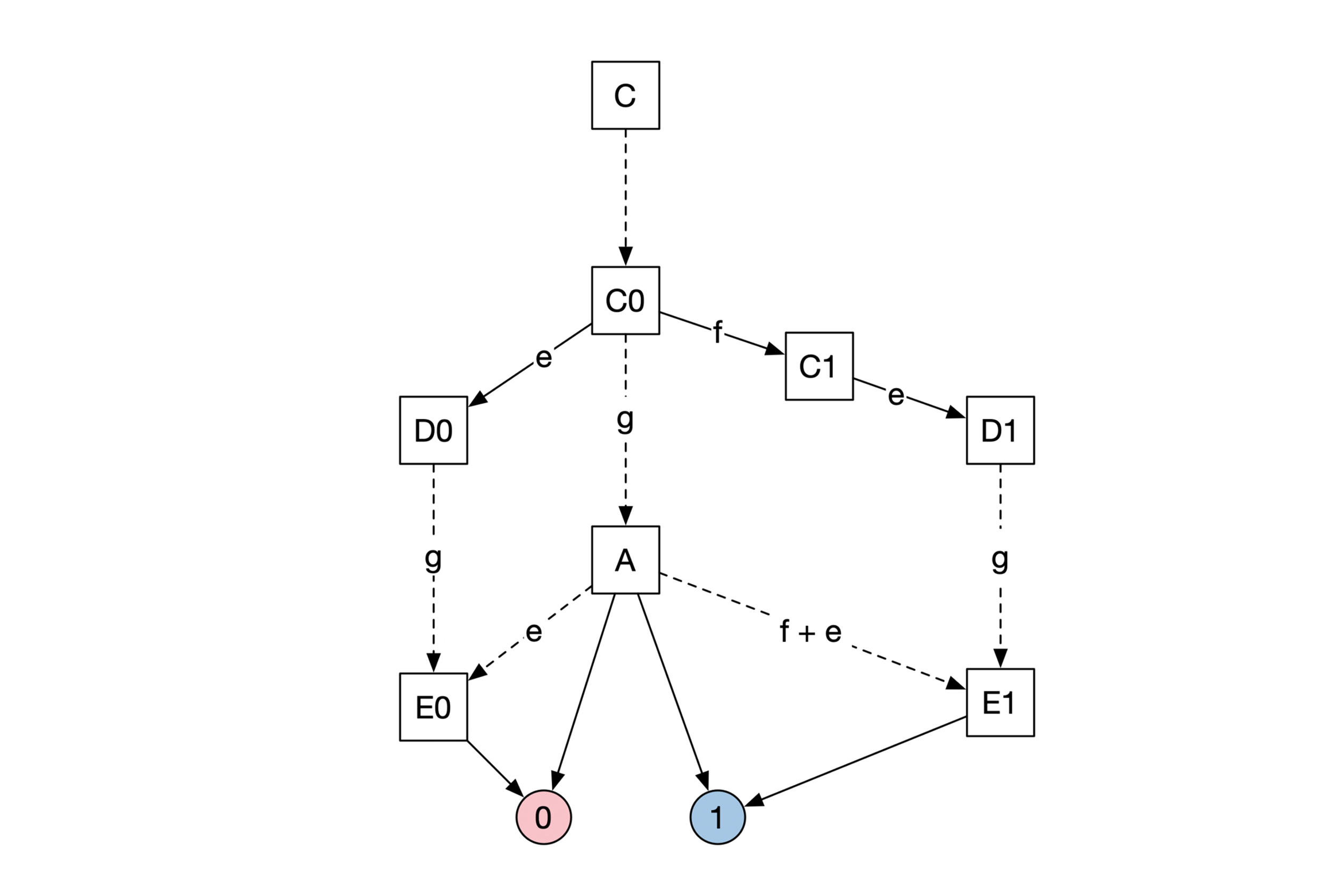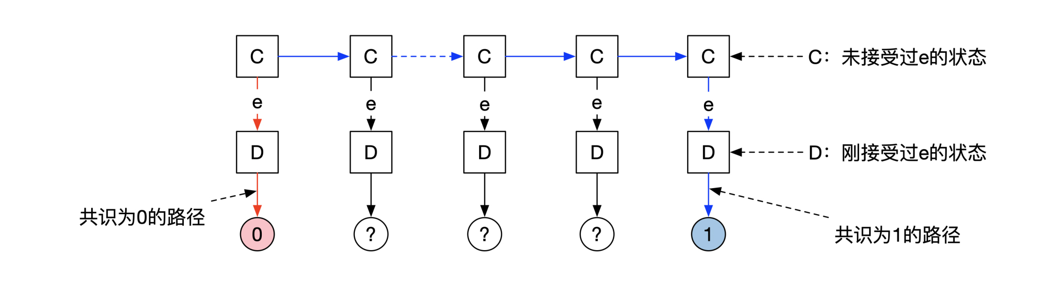 如下图所示,我们假设状态C0在收到消息e后会进入状态D0,D0最终输出共识为0。状态C0收到消息f后,会进入状态C1,C1收到消息e后,会进入状态D1,D1会输出共识结果为1。