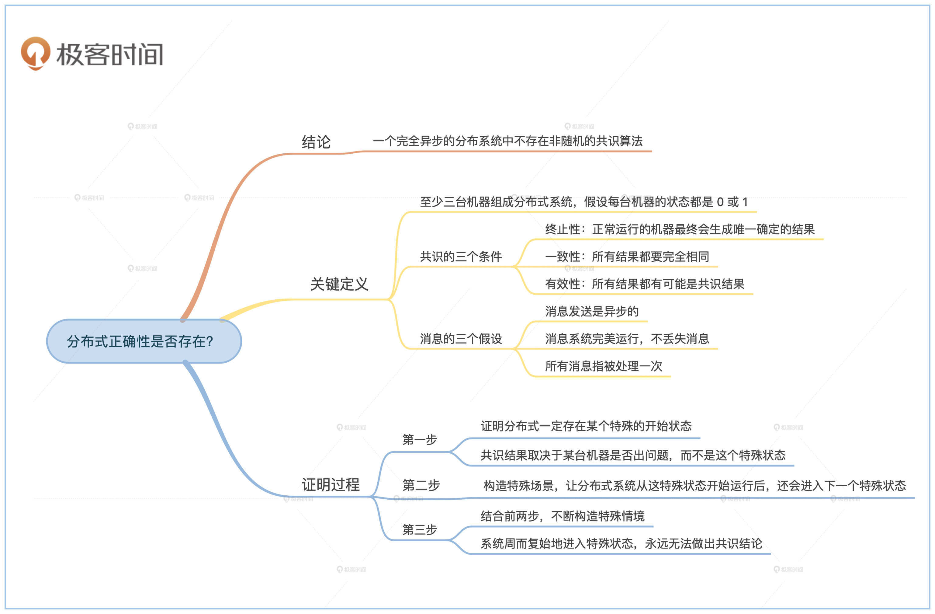 算法课一般会讲如何实现一个算法,很少会谈到如何证明算法不存在。证明算法存在只需要举个例子就可以,但是证明算法不存在,就需要证明所有可能的算法都不行,难度非常高。你可以通过下面的证明,提高自己对分布式系统复杂度的理解。
