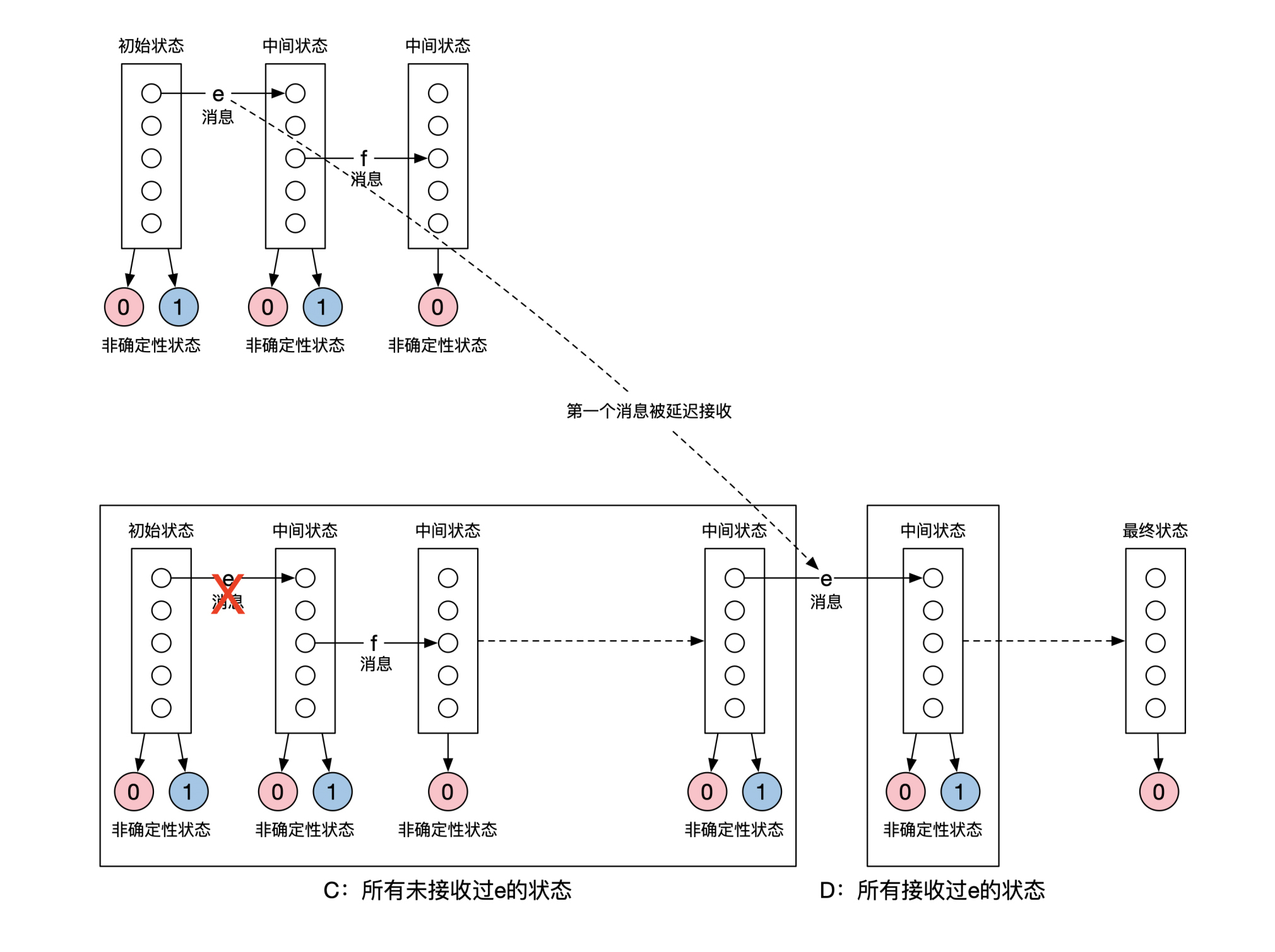 一类是从来没接收过消息e的状态,我们称之为C,另一类是刚刚接收过消息e的中间状态集合,称之为D。剩下的中间状态跟证明无关,可以忽略。