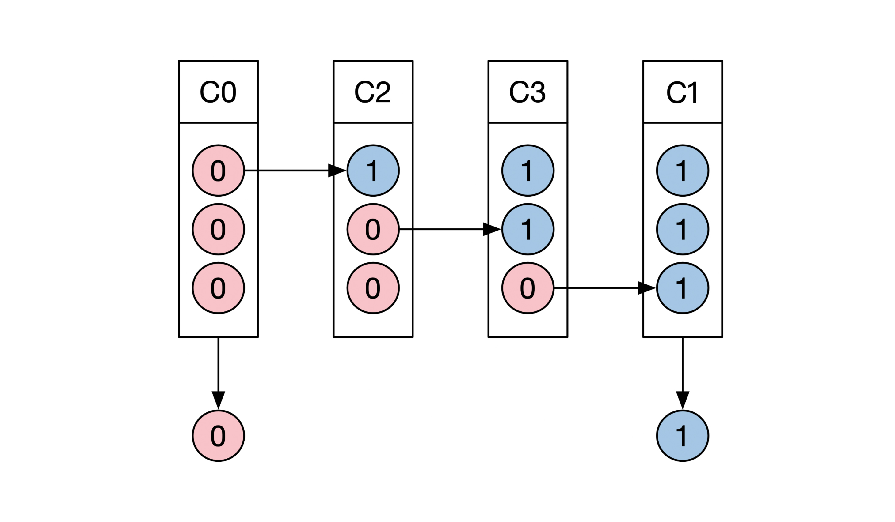 举个例子,如下图所示,假设C0里的3台机器初始状态都是0,C0的共识结果为0。C1的所有初始状态都为1,共识结果为1。C2将C0里的第1台机器的初始状态从0变为1。C3将C2里的第2台机器的状态变为1。这样通过3次变化,我们最终可以将初始状态C0变为C1: