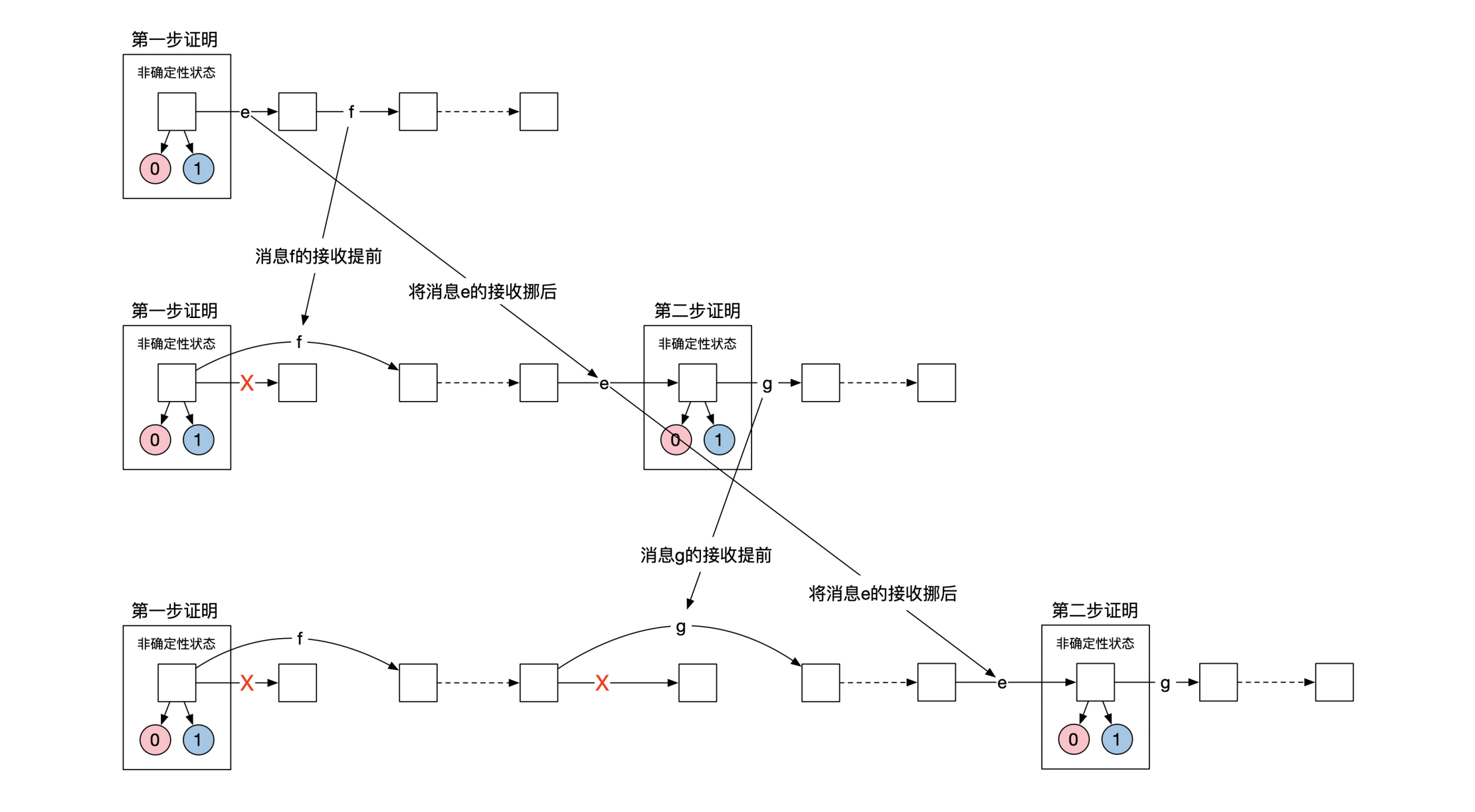 这样每当到达了一个不确定性状态,我们可以将消息e往后挪,从而制造出下一个不确定性状态。由于这个过程可以永远重复下去,系统会永远处于非确定性状态,这就违反了共识算法的第一个特性终止性。示意图如下: