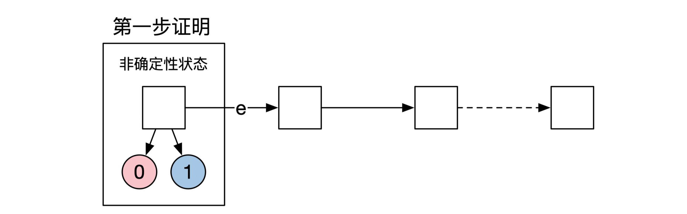 和第一步证明一样,分布式系统的状态也分为非确定性状态和确定性状态两种。系统可能从非确定性状态运行至确定性状态,但是反过来不行。路径和两种状态的示意图如下:-