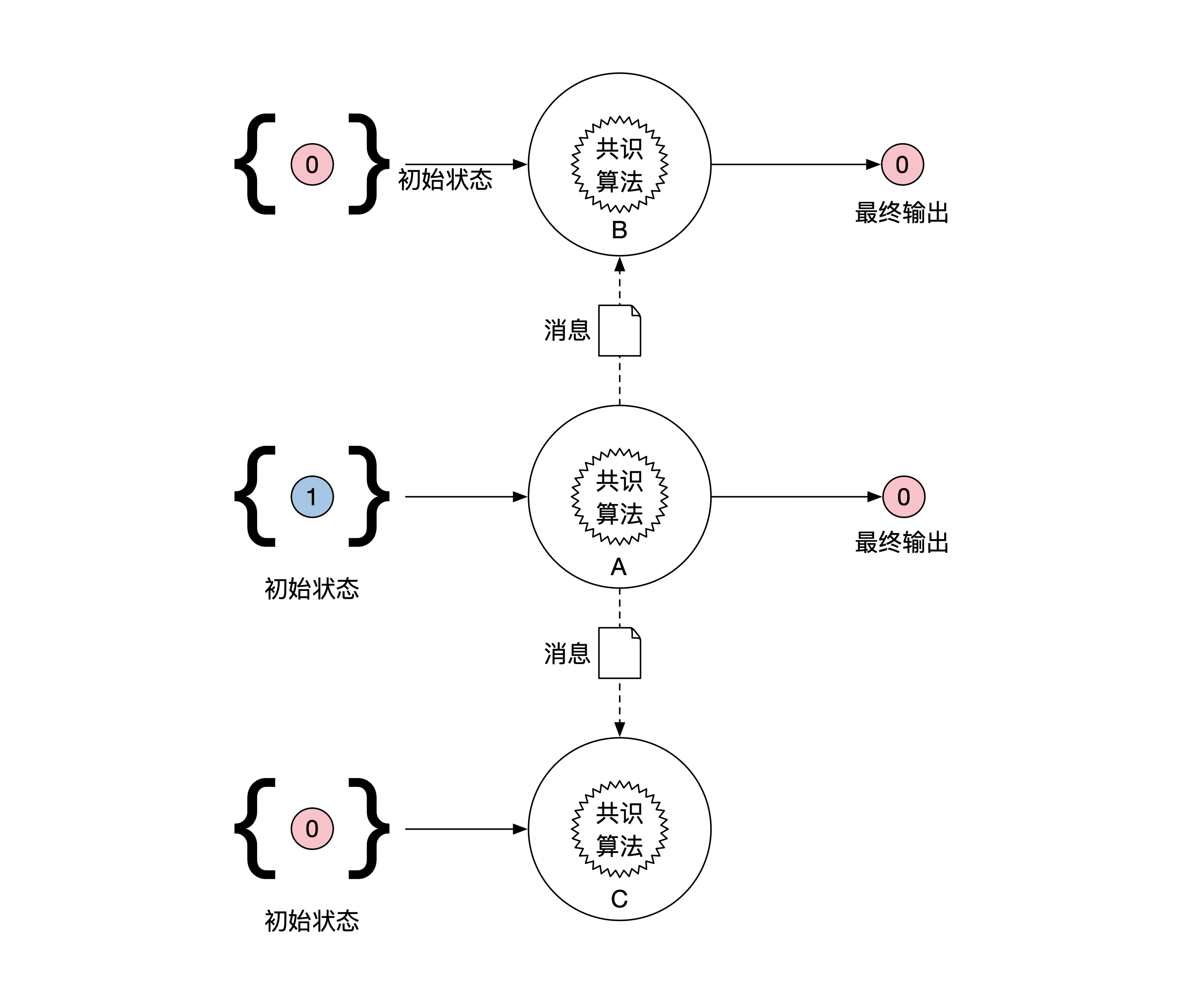 分布式系统由至少3台机器组成。每台机器都有自己的初始状态。为了方便证明,我们假设状态是二元的,即只能是0或者1。不是二元状态的情况和二元状态一样,只是证明过程会稍微繁琐一点。