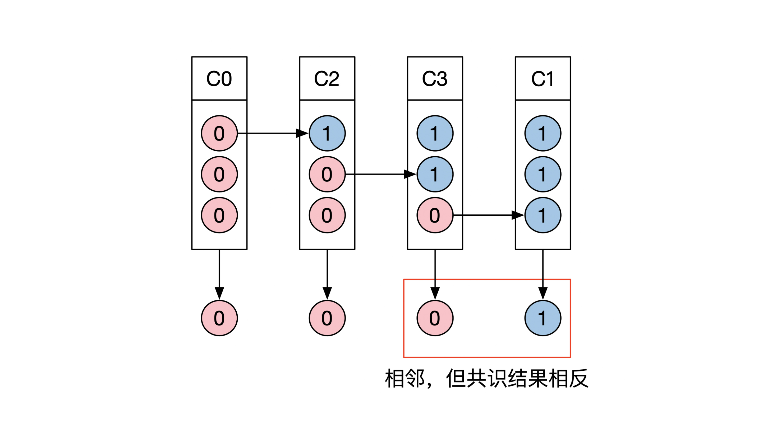 我们假设C2和C3对应的共识结果都为0,这样C3和C1这两个相邻的初始状态集合,就会有不同的共识结果: