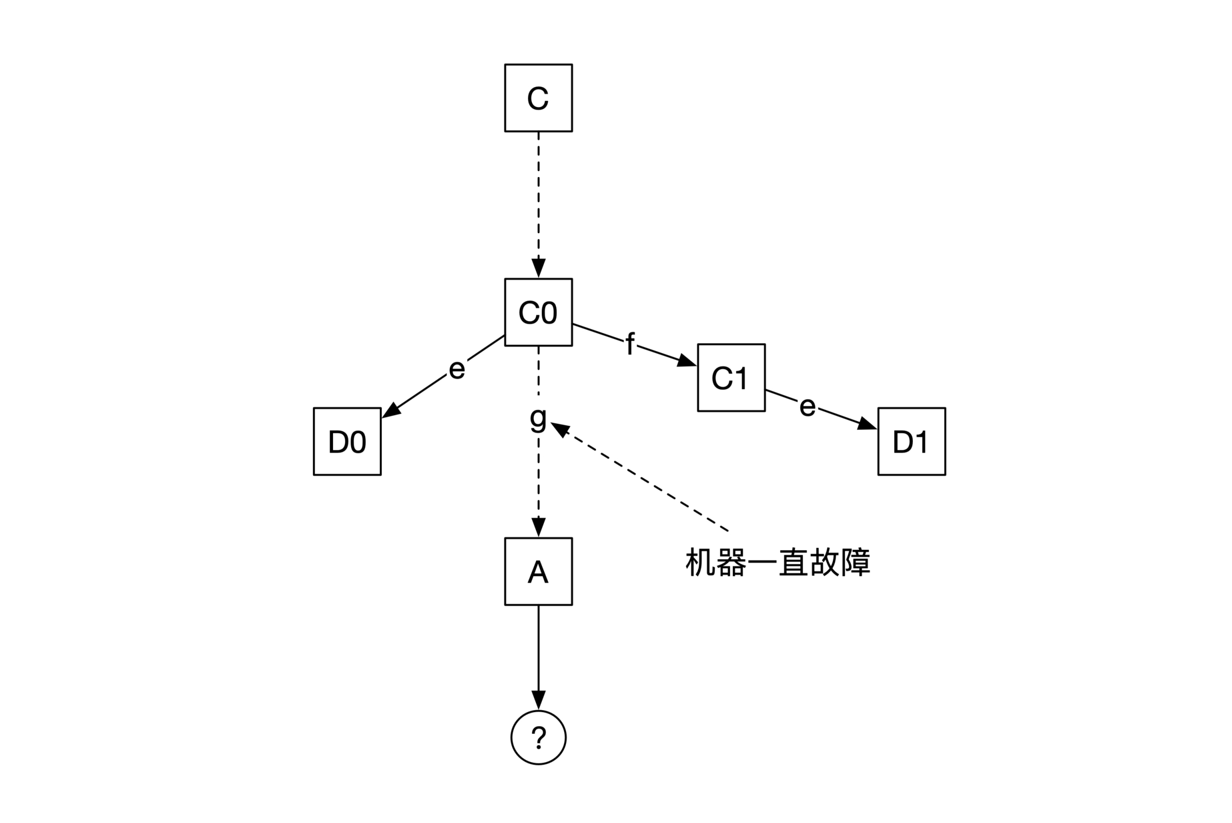 那我们再来看看如果e和f的接收方一样,又会出现什么情况。我们假设从状态C0开始,接收这两个消息的机器就出了故障,无法运行。系统在经过了一条路径g后,到达最终状态A,并且产生共识结果。因为无限路径和共识算法的终止性相矛盾,所以路径g的步数是有限的,。