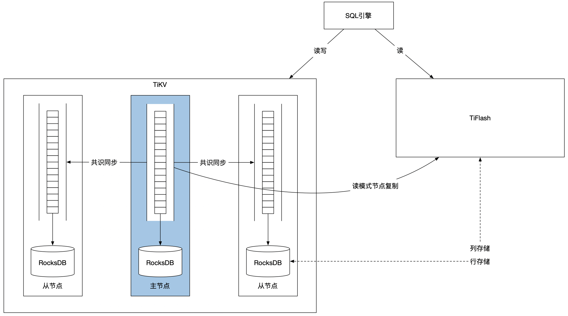 TiDB进一步优化了Spanner的设计。它将关系型数据库的存储抽象成了独立的分布式K/V存储,负责解决数据库的写入操作,同时用基于列存储方式的TiFlash来实现数据库的查询操作。TiFlash通过读模式状态机的方式,从TiKV的共识算法主节点同步数据。