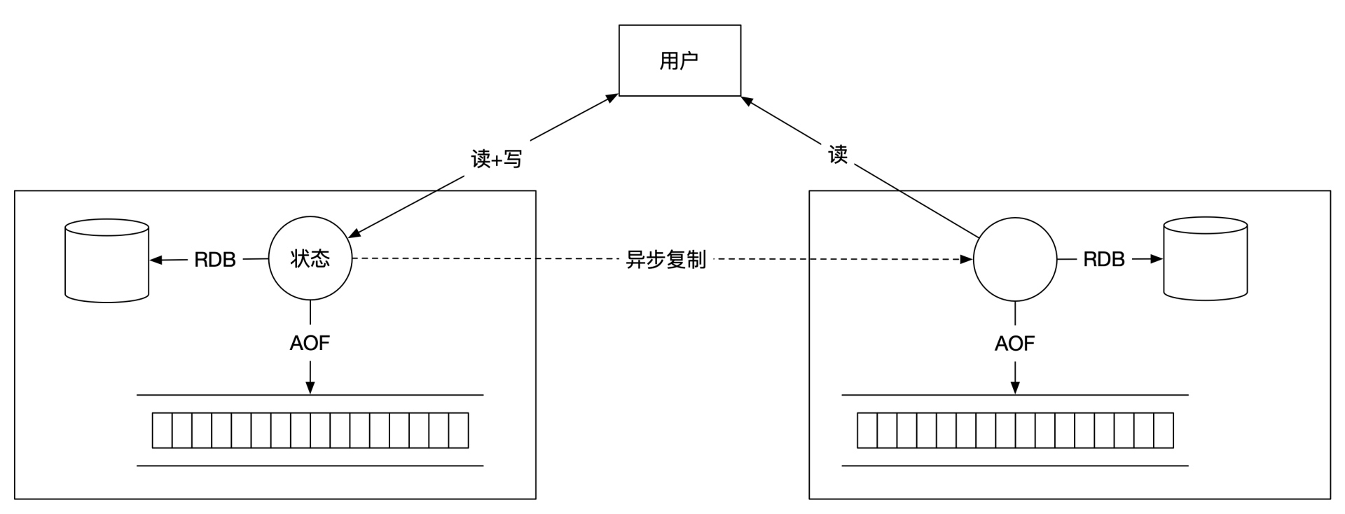 接下来,我们再看看本地数据备份的两个优化选择。主节点可以选择将一部分数据保存在本地,之后可以用这些数据来恢复单机状态。一个选择是RDB,Redis会定期将内部状态保存到本地硬盘;另一个选择是AOF,Redis会将操作日志实时保存到本地硬盘。