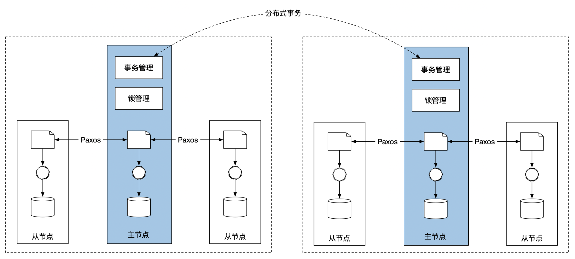 Paxos算法的节点也有主从之分。共识算法的主节点会承担起实现分布式锁的责任,同时它也负责维护集群的事务管理。如果事务需要横跨多个不同的Spanner组,那么每个组的主节点会互相沟通,选一个主节点作为分布式事务的协调者,用两阶段提交的方式来实现分布式事务。