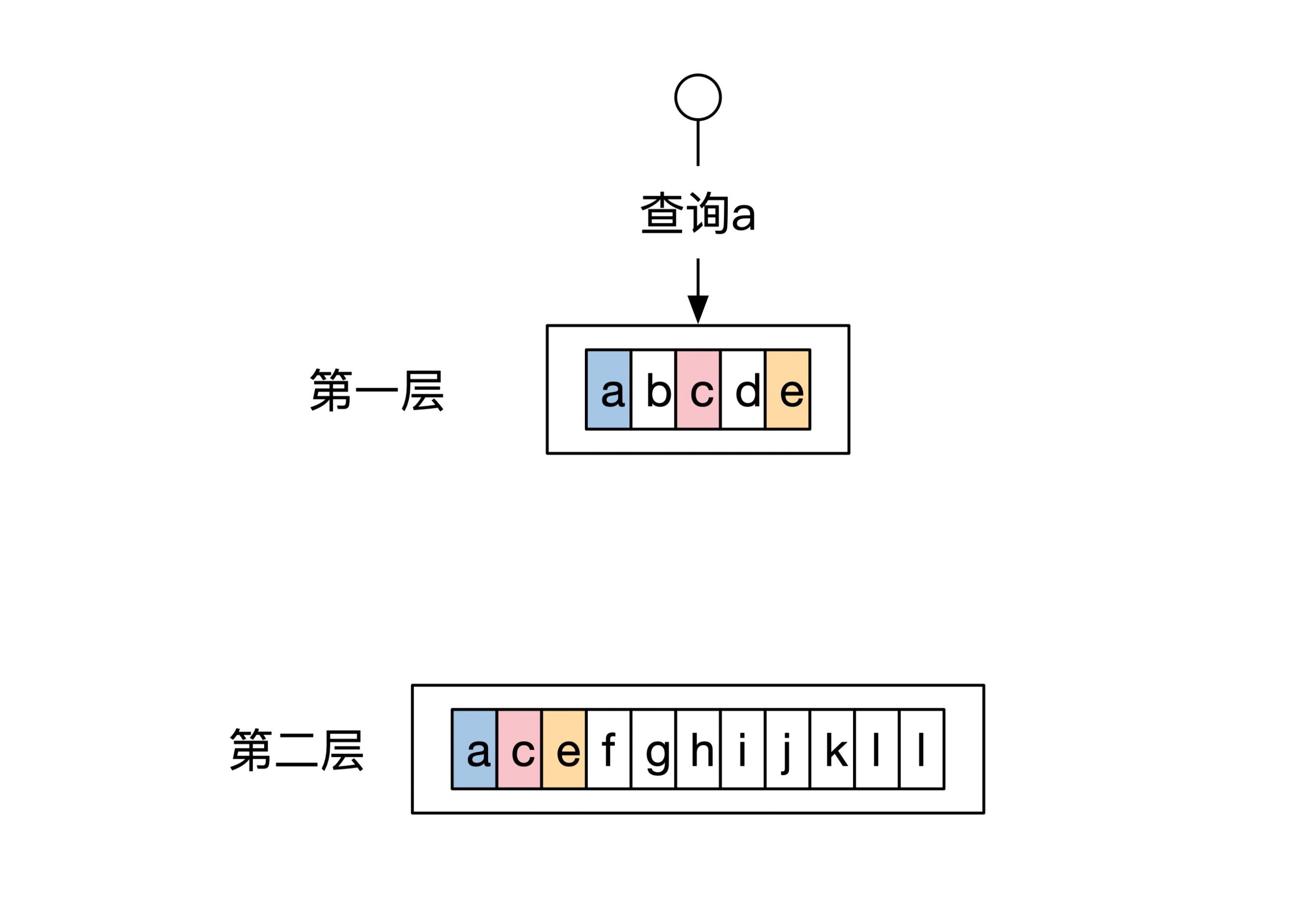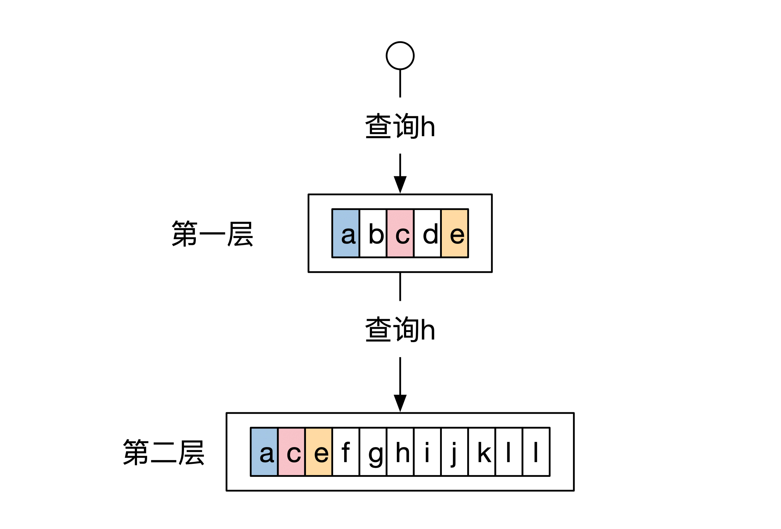 但是如果我们换一下查询的条件。这时候查询的是h,而不是a。第一层不包含键为h的数据,因此查询会继续访问第二层。下面这幅图展示了这个查询过程: