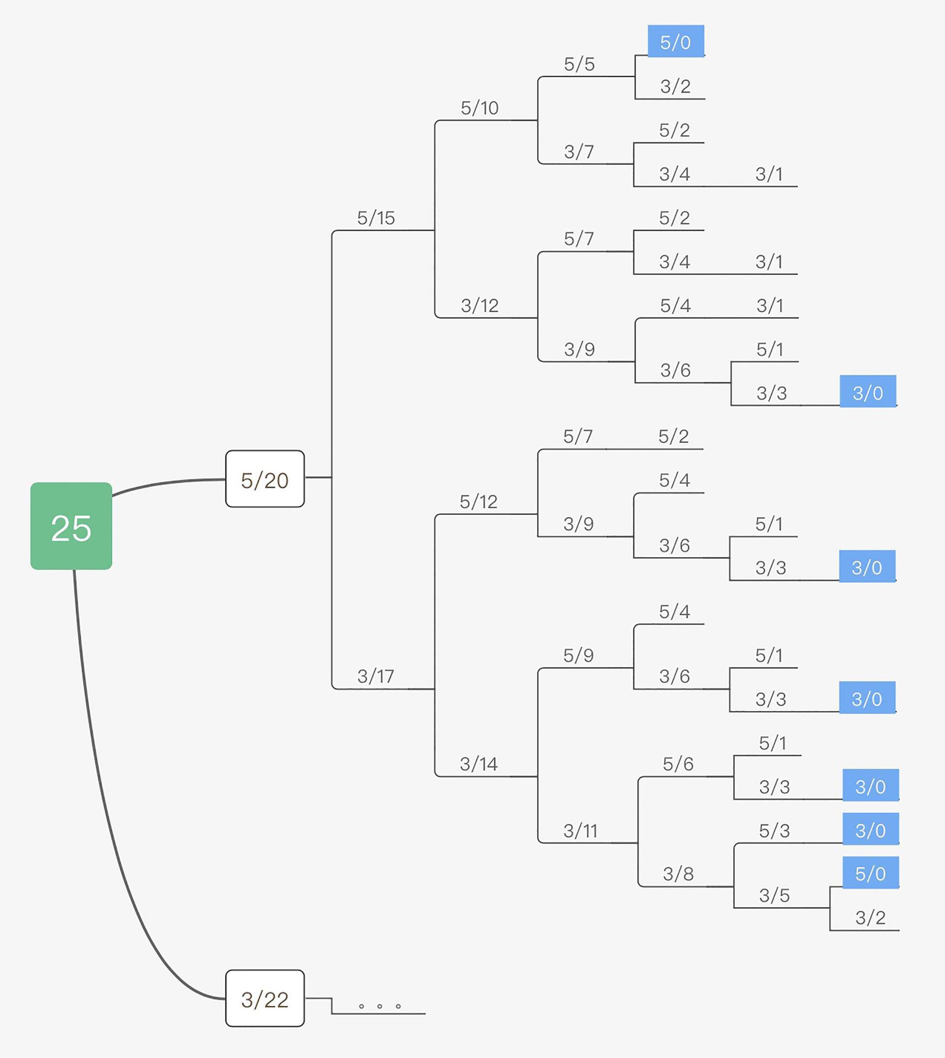 你可以从中看到形象的递归求解过程,每个节点的 /(斜线)左边表示当前节点使用的硬币面值,右边表示使用面值后的余额。图中的蓝色节点就表示我们目前得到的解。