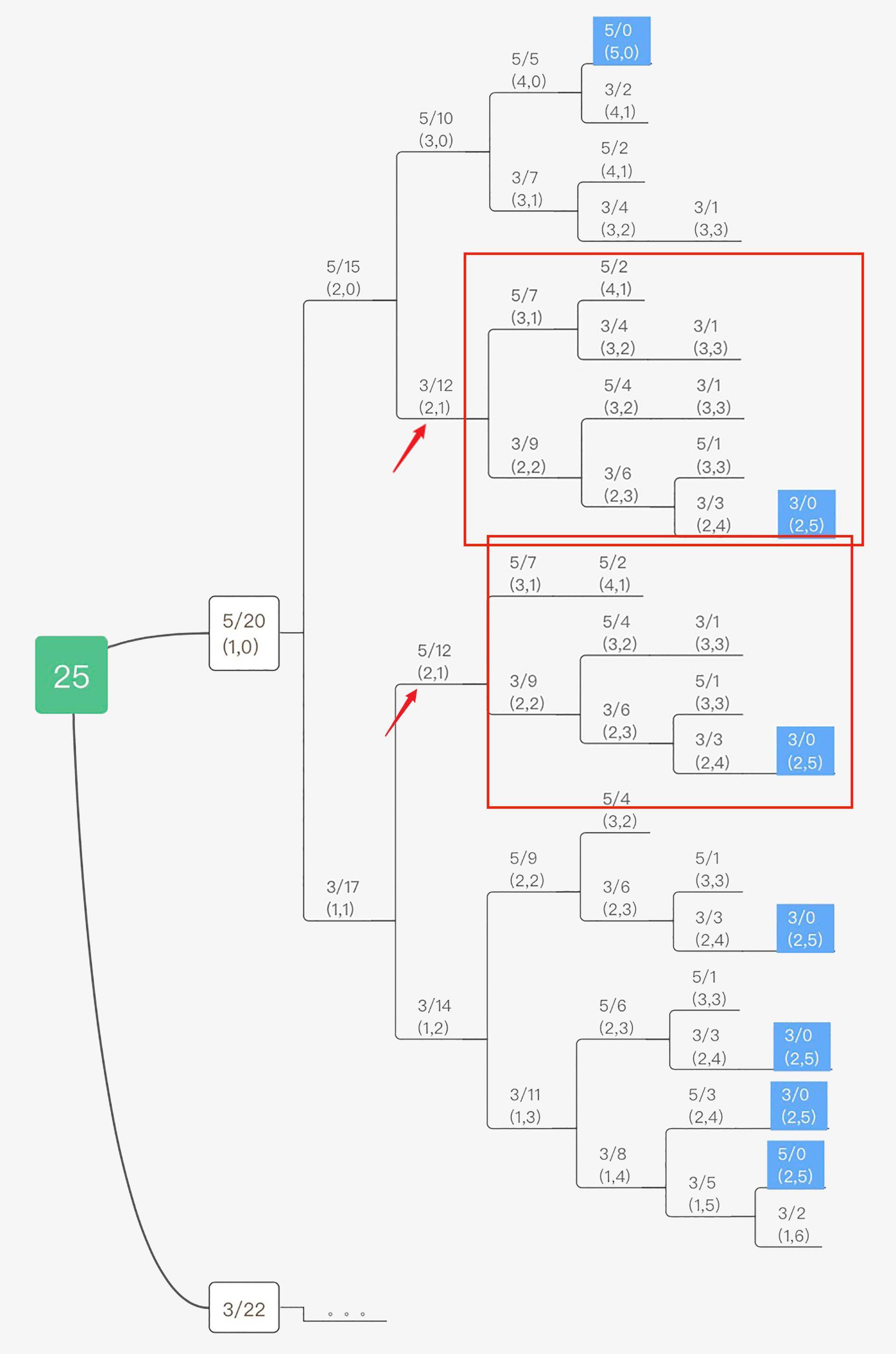 从上图中,我们看到了类似的模式,我同样圈选出了两个红色区域,其中第2个即5/12(2, 1)的递归子问题与第1个 312(2, 1) 的递归子问题完全相同,因此它们是重叠子问题