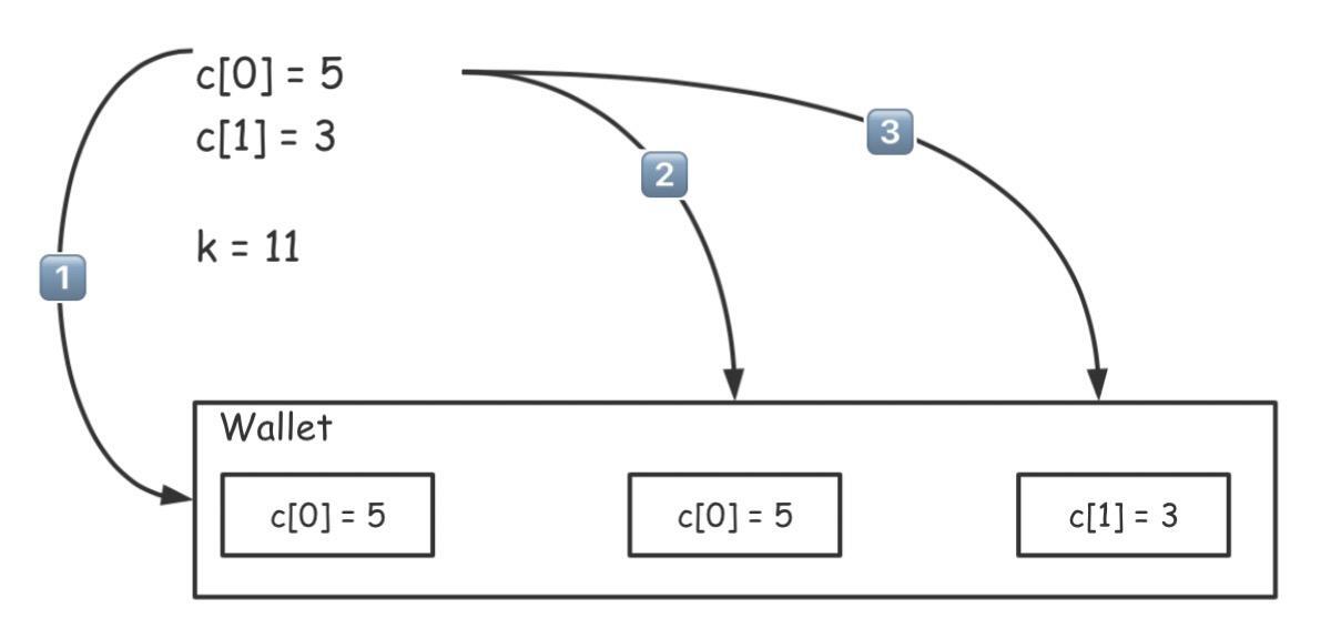 我们从 c[0]=5, c[1]=3 且 k=13 的情况下寻求最少硬币数。按照“贪心原则”,我们先挑选面值最大的,即为 5 的硬币放入钱包。接着,还有 8 元待解(即13-5 = 8)。这时,我们再次“贪心”,放入 5 元面值的硬币。这个时候我们就只剩下 3 元了,我们再放入 3 就可以凑足 13 元了。而且这肯定是面值最少的解法。