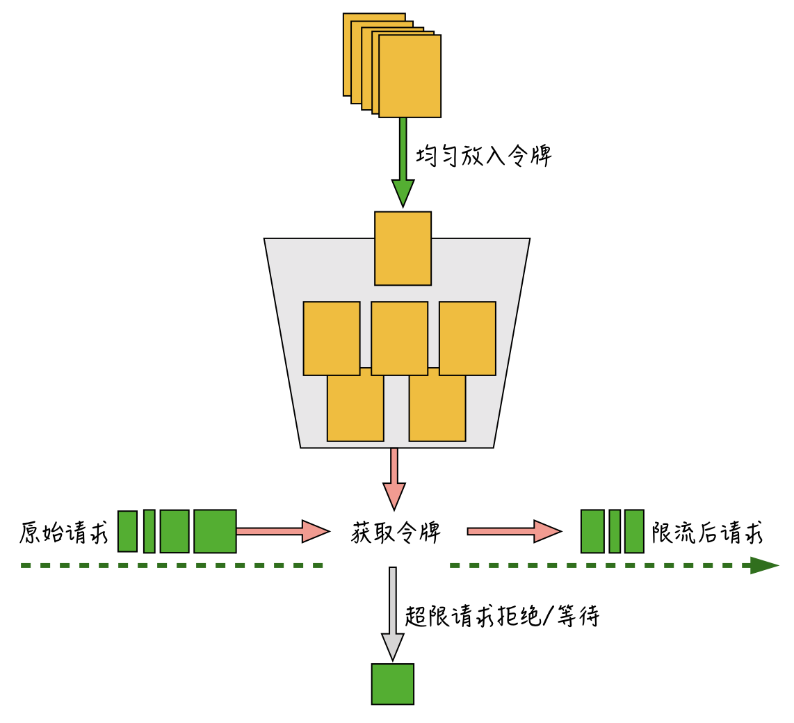 算法按一定速度均匀往桶里放入令牌,原始请求进入后,根据请求量从令牌桶里取出需要的令牌数,如果令牌数不够,会直接抛弃掉超限的请求或者进行等待,能成功获取到令牌的请求才会进入到后端服务器。