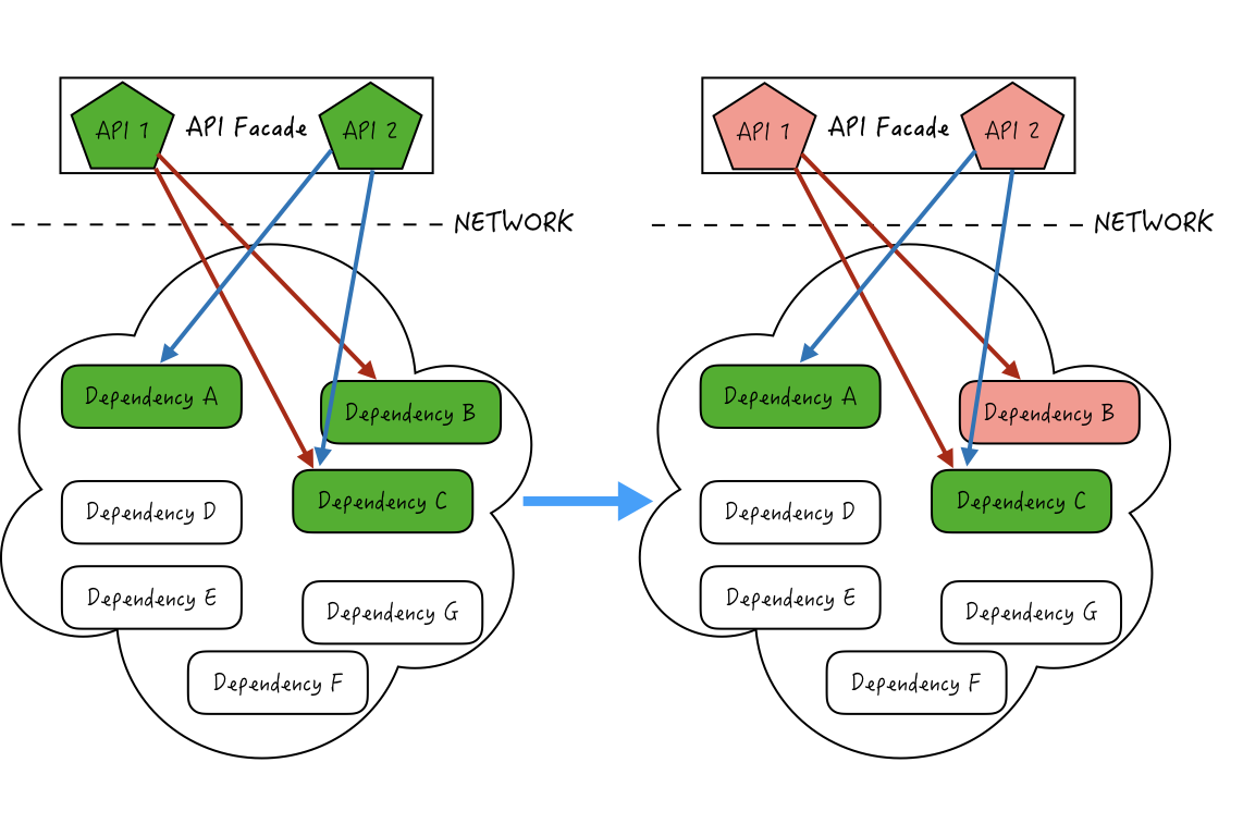 API 1和API 2一起关联部署,而且共同依赖多个依赖服务A、B、C。如果此时API 1依赖的服务B由于资源或者网络等原因造成接口变慢,就会导致和API 1一起关联部署的API 2也出现整体性能被拖累变慢的情况,继而导致依赖API 1和API 2的其他上层的服务也级联地性能变差,最终可能导致系统整体性能的雪崩。