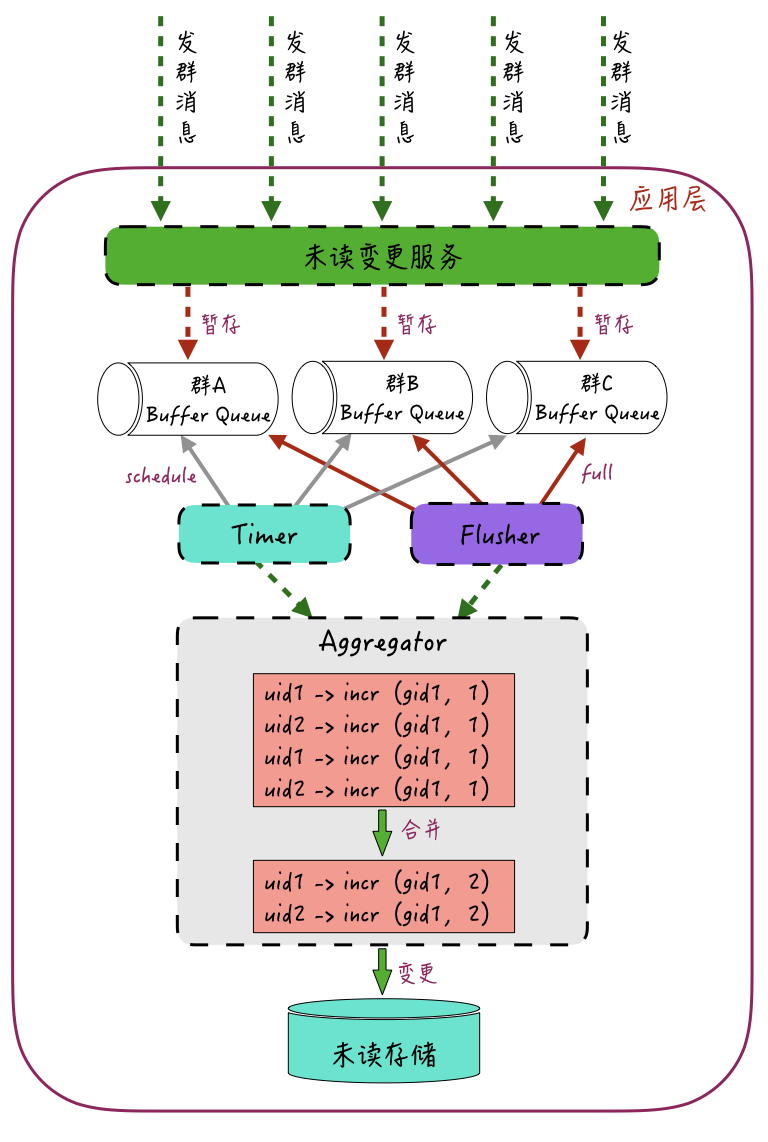 未读变更服务接收群聊的加未读请求,将这些加未读请求按照群ID进行归类,并暂存到群ID维度的多个“暂存队列”中;这些“暂存队列”的请求会通过一个Timer组件和一个Flusher组件来负责处理。