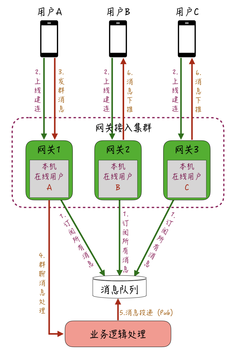 因此,针对万人群聊的场景,我们可以采取类似直播互动中的优化方式,不维护全局的中央“在线状态”,而是让各网关机“自治”,来维护接入到本机的连接和群的映射。你可以参考下图所示的实现过程:-