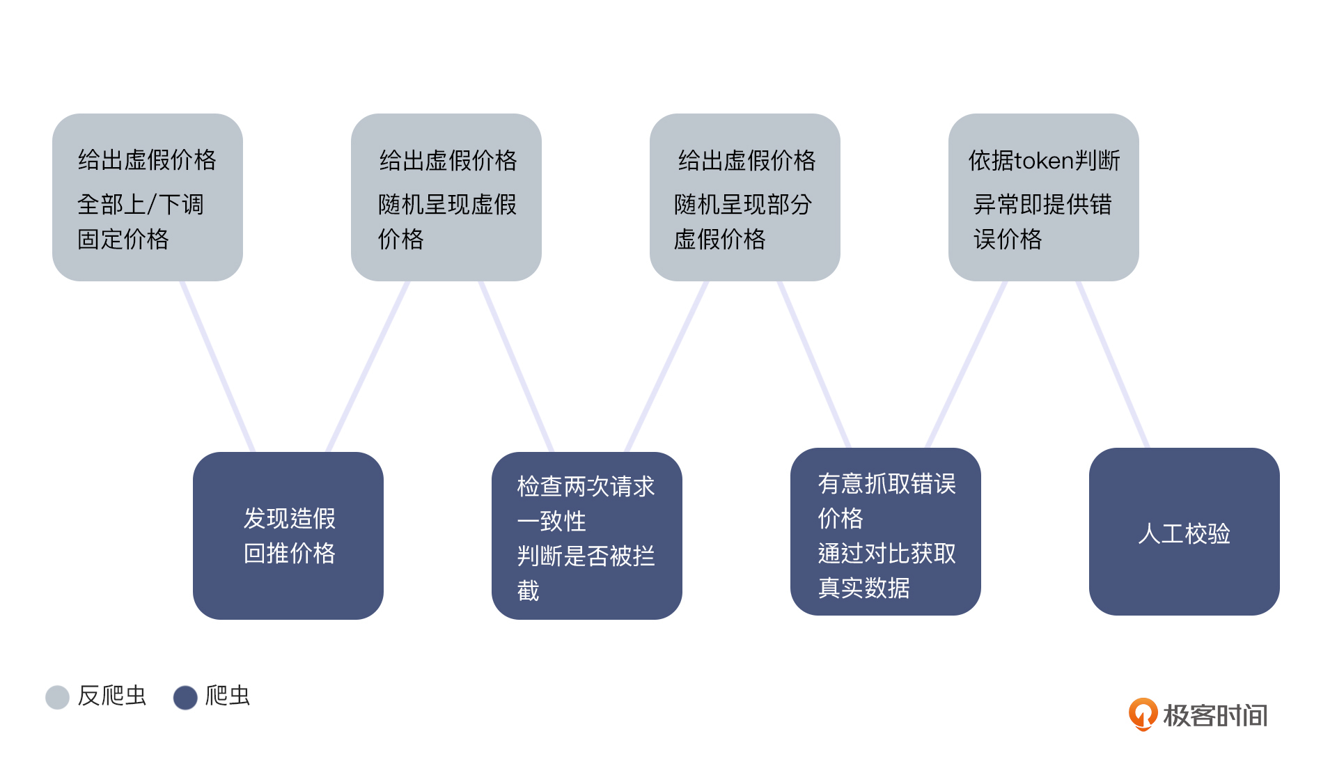 我们现在来看一个新的战况:爬虫方B公司,在爬取走高端路线的A公司的价格的时候,每次都拿到80。也就是说,反爬虫方A选择用不同的价格迷惑对方。时间长了,爬虫方B公司就会发现不对了:80是一个亏本价格,不符合A走高端路线的风格。稍加分析就会发现:价格被掺假了,下降了20%。