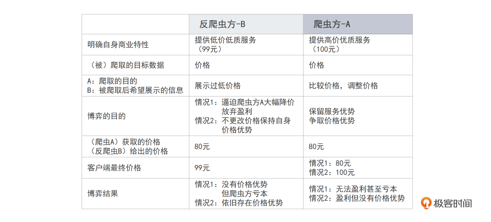 例如,AB两家公司,A的商业策略是,优先保证盈利,保护股东利益。而B的商业策略是,尽可能低价占领市场。那么当他们互相爬取对方的时候,反爬团队都会如何处理呢?这里我为你准备了一个表格,你可以在学习的时候思考一下,AB两家公司双方都在想些什么。-