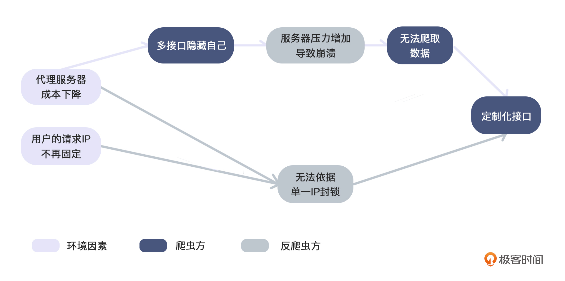 而第二条路,不仅和代理服务器成本下降有关,更有大环境影响的因素。随着移动互联网的普及,用户的请求IP不再是固定的,同一个IP上一秒还归路人甲使用,下一秒可能就给路人乙了。反爬虫方也不太敢继续依据固定IP的访问频率封锁了。
