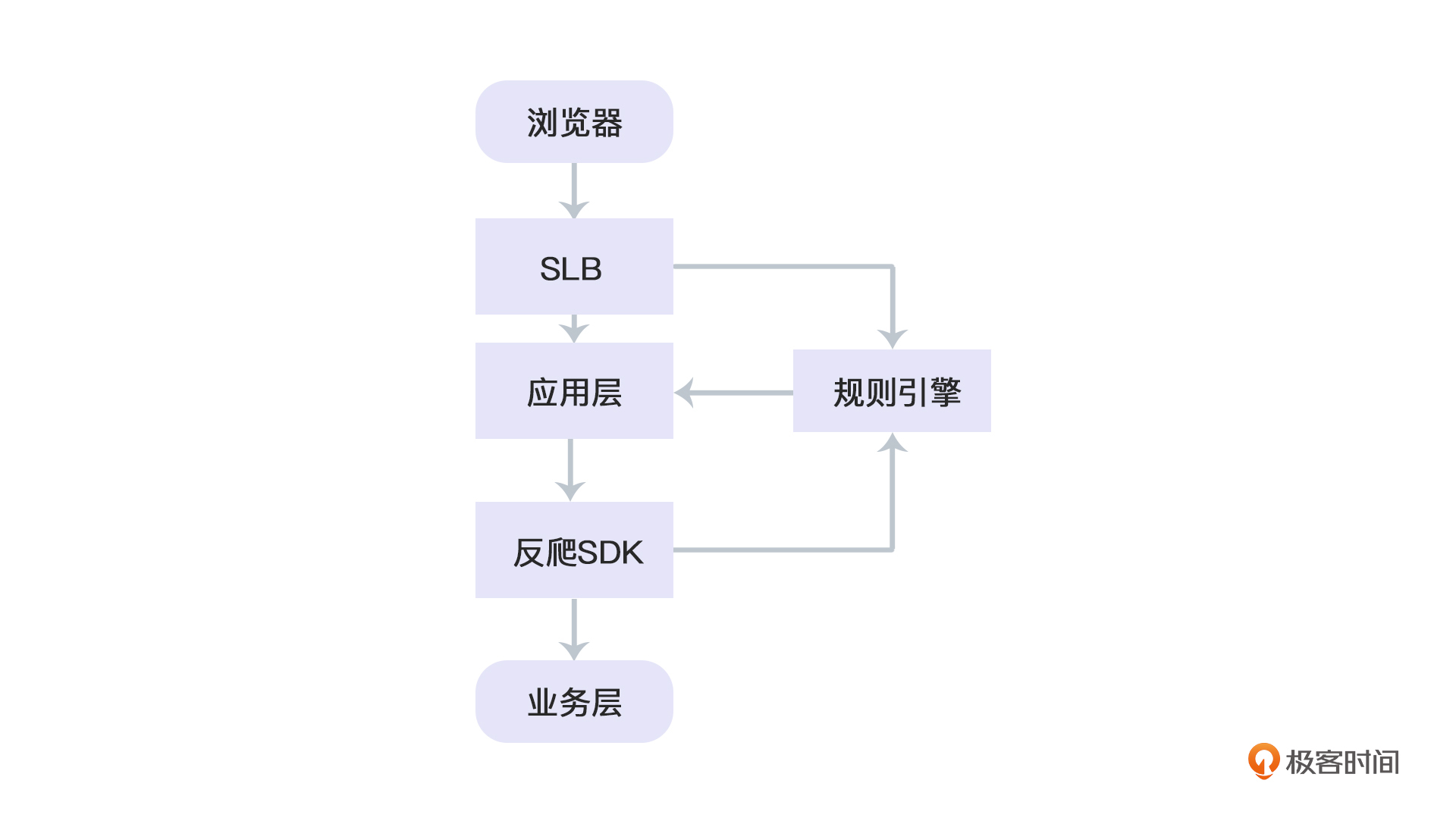 例如,和反爬SDK耦合,作为一个依赖注入到应用层与业务层之间。通过这样的熔断方式,甚至可以秒级下线反爬虫——你只需要无脑下线规则引擎即可。然后再慢慢摘除后遗症(规则引擎我会在接下来的第15课给你详细讲解)。