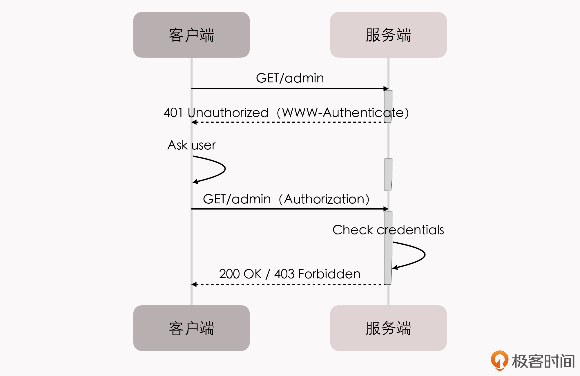 不过,只有这种概念性的介绍,你可能还是会觉得有点儿枯燥和抽象,接下来我就以最基础的认证方案HTTP Basic Authentication为例,来给你解释下认证具体是如何工作的。