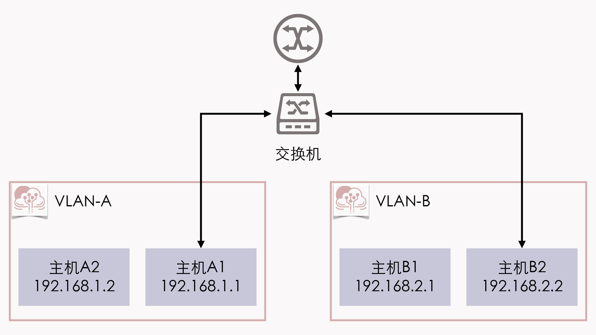 由于A1、B2各自处于独立的网段上,它们又各自要把同一个路由作为网关使用,这就要求路由器必须同时具备192.168.1.0/24和192.168.2.0/24的IP地址。当然,如果真的就只有VLAN-A、VLAN-B两个VLAN,那把路由器上的两个接口分别设置不同的IP地址,然后用两条网线分别连接到交换机上,也勉强算是一个解决办法。