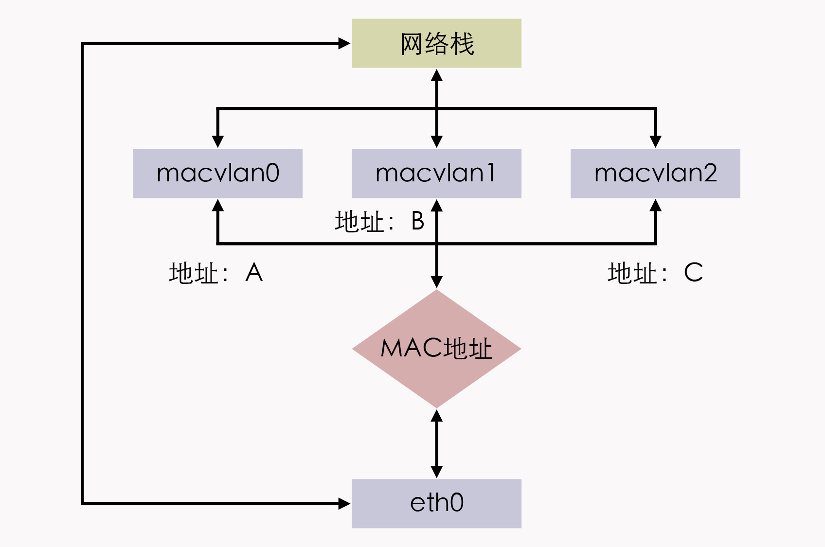 原本MAC地址是网卡接口的“身份证”,应该是严格的一对一关系,而MACVLAN打破了这层关系。方法就是在物理设备之上、网络栈之下生成多个虚拟的Device,每个Device都有一个MAC地址,新增Device的操作本质上相当于在系统内核中,注册了一个收发特定数据包的回调函数,每个回调函数都能对一个MAC地址的数据包进行响应,当物理设备收到数据包时,会先根据MAC地址进行一次判断,确定交给哪个Device来处理,如下图所示。
