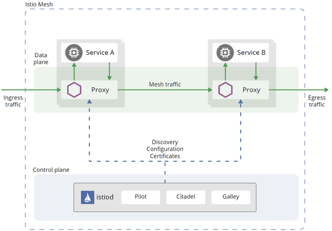 因此,从1.5版本起,Istio重新回归单体架构,把Pilot、Galley、Citadel的功能全部集成到新的Istiod之中。当然,这也并不是说完全推翻之前的设计,只是将原有的多进程形态优化成单进程的形态,让之前各个独立组件变成了Istiod的内部逻辑上的子模块而已。