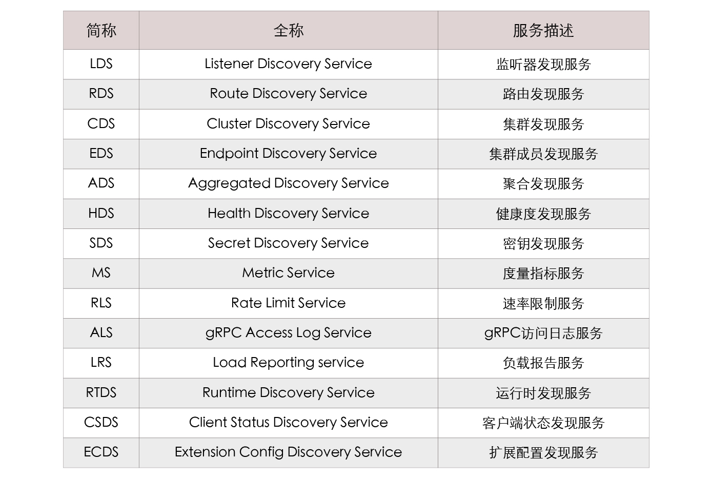 因此针对这个问题,Envoy在这方面进行了创新,它将代理的转发的行为规则抽象成Listener、Router、Cluster三种资源。以此为基础,它又定义了应该如何发现和访问这些资源的一系列API,现在这些资源和API被统称为“xDS协议族”。自此以后,数据平面就有了如何描述各种配置和策略的事实标准,控制平面也有了与控制平面交互的标准接口,目前xDS v3.0协议族已经包含有以下具体协议: