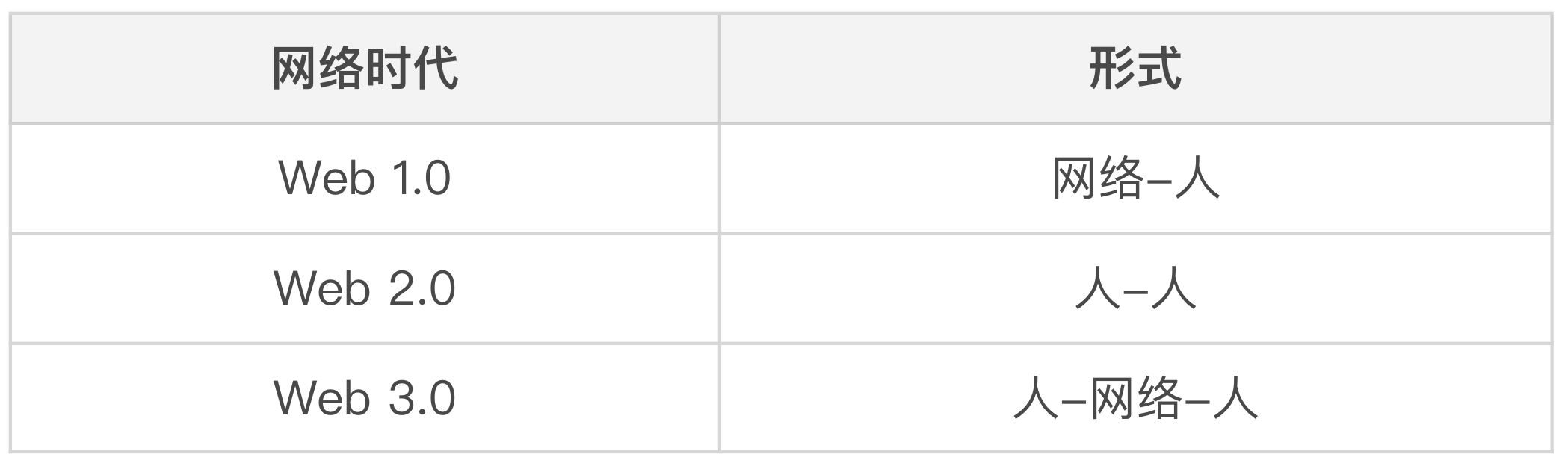 Web 1.0:单向信息,只读;- Web 2.0:以网络为渠道进行人际沟通;- Web 3.0:人工智能、关联数据和语义网络构建,形成人和网络以及网络与人之间的沟通。