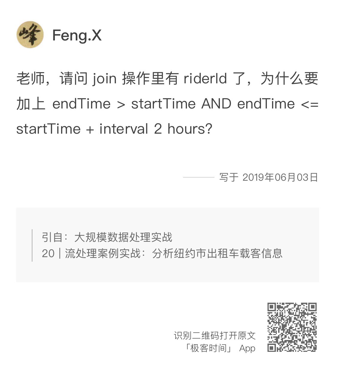 Feng.X同学不是很理解实例中两个Streaming DataFrame Join时,为什么要加上事件时间的限制“endTime > startTime AND endTime <= startTime + interval 2 hours”。