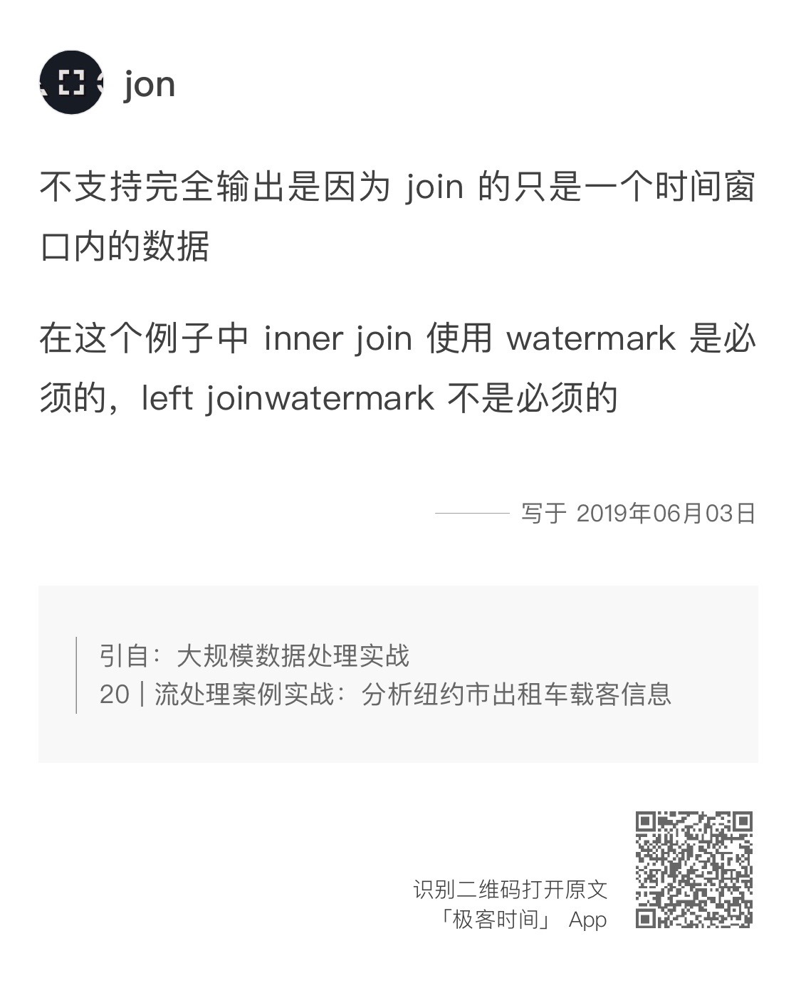 第20讲的思考题是,为什么流的Inner-Join不支持完全输出模式?对于Inner-Join而言,加水印是否是必须的? Outer-Join呢?