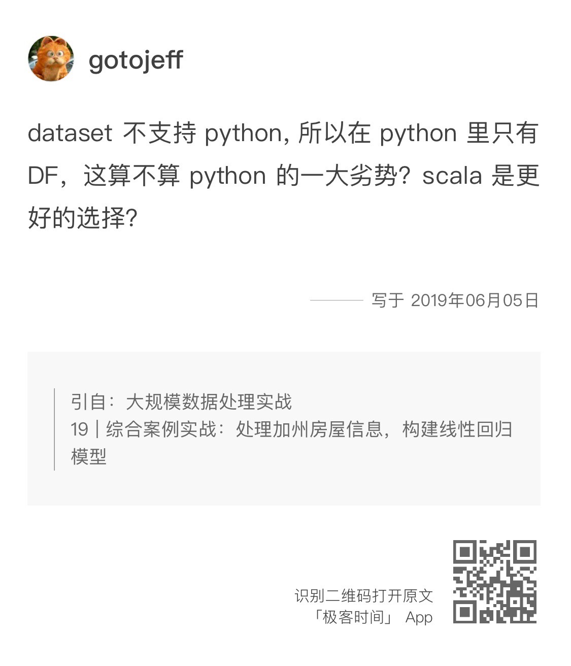 第19讲中,gotojeff提出的这个语言选择问题,其实我之前就提到过,PySpark现在不支持DataSet,只有Scala和Java支持。这是由语言特性决定的,Python是动态类型的语言,而DataSet是强类型的,要求在编译时检测类型安全。所以,在所有用Python的代码例子中,我用的都是DataFrame。