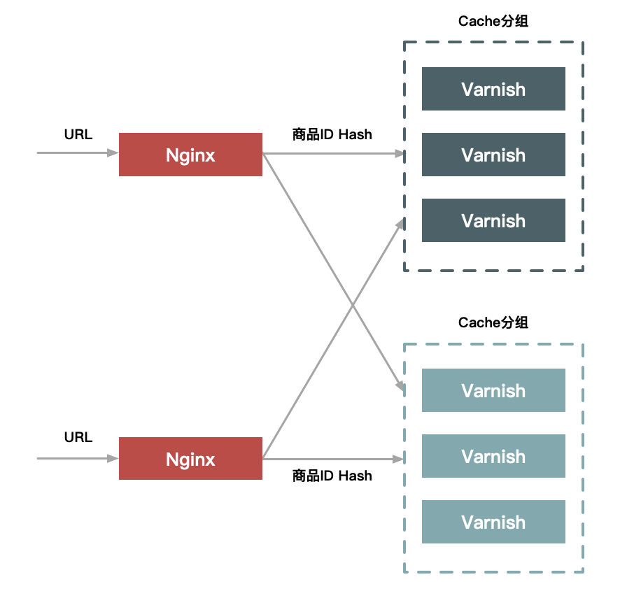 你可能会问:一个商品数据存储在多个Cache实例中,如何保证数据一致性呢?(关于失效问题大家问得也比较多,后面再回答。)这个专栏中提的Hash分组都是基于Nginx+Varnish实现的,Nginx把请求的URL中的商品ID进行Hash并路由到一个upstream中,这个upstream挂载一个Varnish分组(如下图所示)。这样,一个相同的商品就可以随机访问一个分组的任意一台Varnish机器了。
