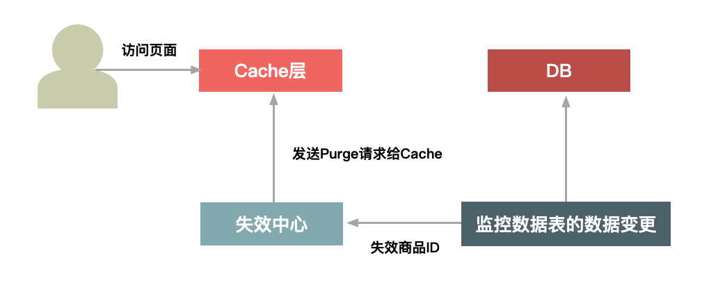失效中心会监控关键数据表的变更(有个中间件来解析MySQL的binglog,然后发现有Insert、Update、Delete等操作时,会把变更前的数据以及要变更的数据转成一个消息发送给订阅方),通过这种方式来发送失效请求给Cache,从而清除Cache数据。如果Cache数据放在CDN上,那么也可以采用类似的方式来设计级联的失效结构,采用主动发请求给Cache软件失效的方式,如下图所示: