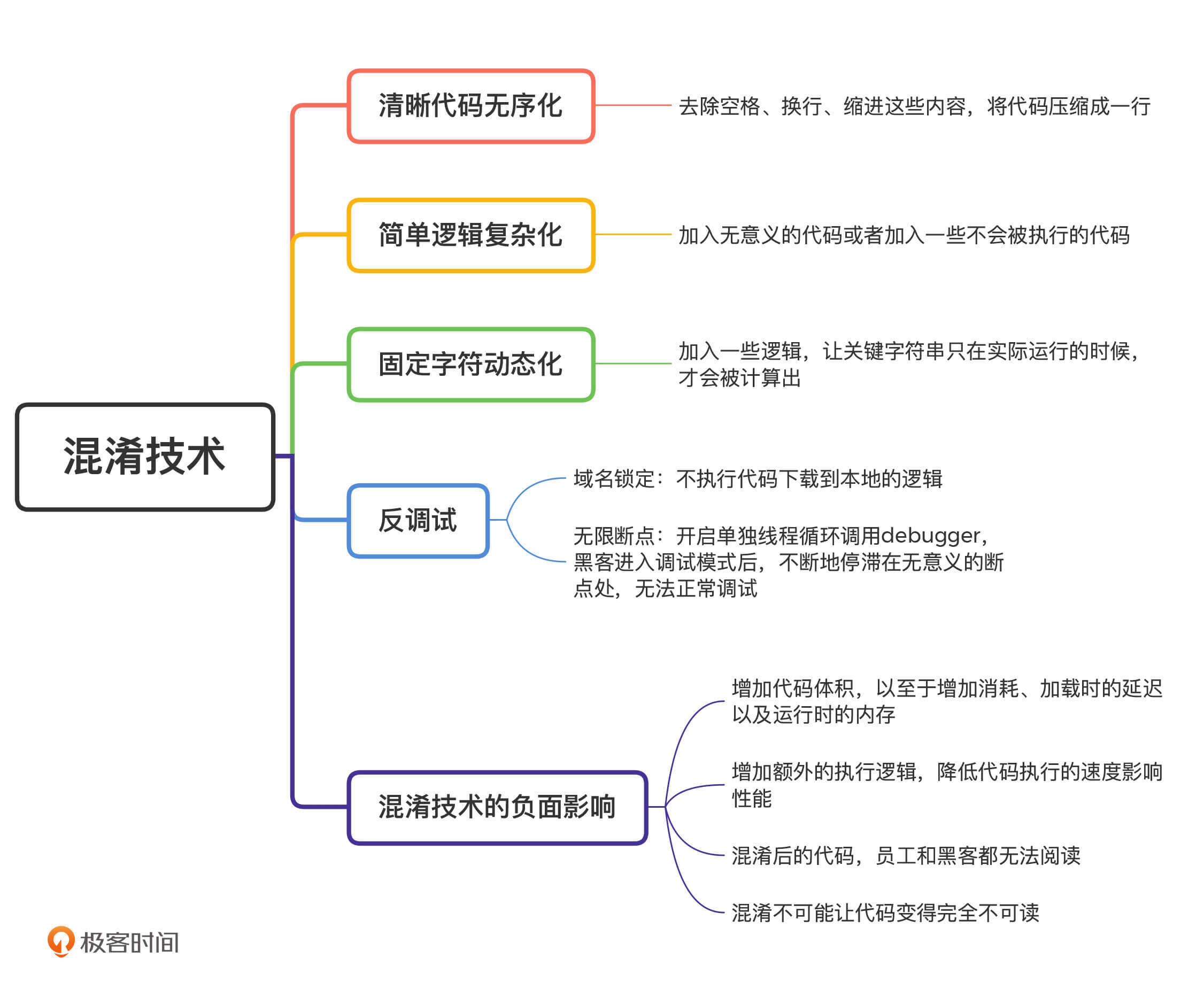你还需要注意一点:混淆不可能让代码变得完全不可读。因为你的代码最终需要执行在用户终端,而执行的条件就是终端能够读懂代码。以JavaScript为例,黑客完全可以自己定义一个浏览器来执行JavaScript代码。这样一来,尽管黑客没办法直接阅读JavaScript文件,但仍然可以通过浏览器执行的指令集和内存环境来进行分析。